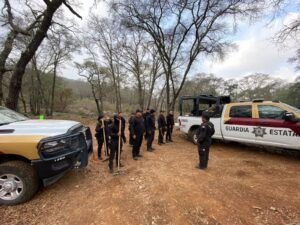 Protección Civil del Estado, la Secretaría de Desarrollo Urbano y Medio Ambiente (SEDUMA), y de la Comisión Nacional Forestal (CONAFOR).La Guardia Estatal destinó elementos provenientes de diversas coordinaciones y Estaciones Seguras, quienes utilizan herramientas especializadas como rastrillos de pico, machetes, palas y arañas.