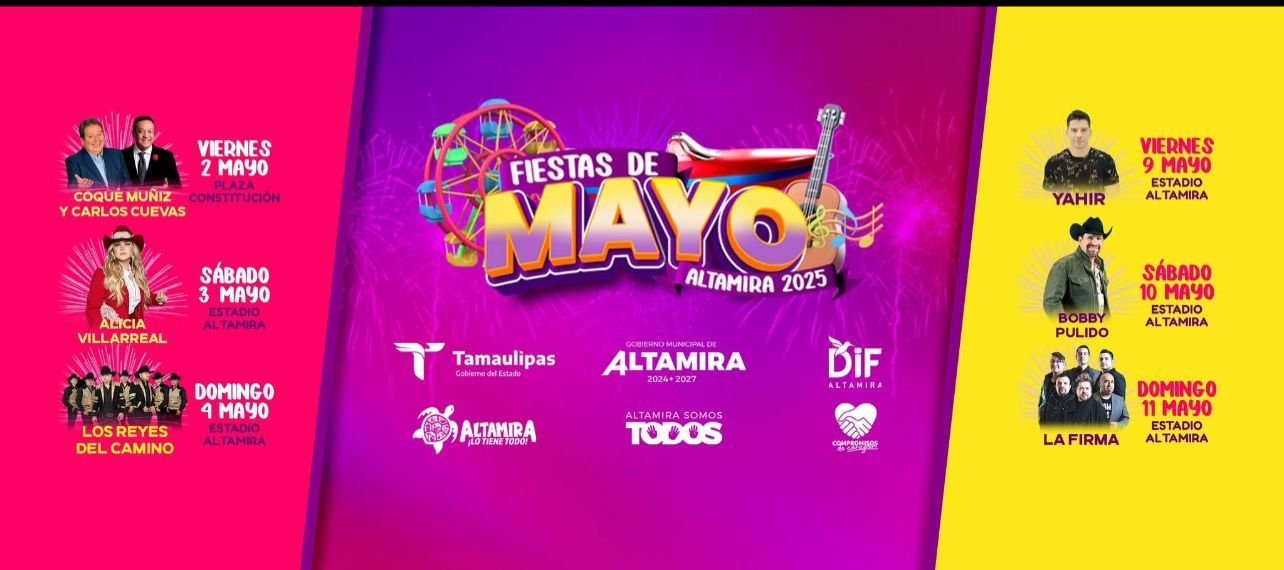 Con el firme compromiso de fortalecer las tradiciones y brindar espacios de sano esparcimiento para las familias altamirenses, el presidente municipal, Dr. Armando Martínez Manríquez, anunció la realización de las Fiestas de Mayo Altamira 2025, las cuales se llevarán a cabo del 30 de abril al 18 de mayo con juegos mecánicos totalmente gratuitos para niñas y niños, y una cartelera de grandes conciertos en el Estadio Altamira.