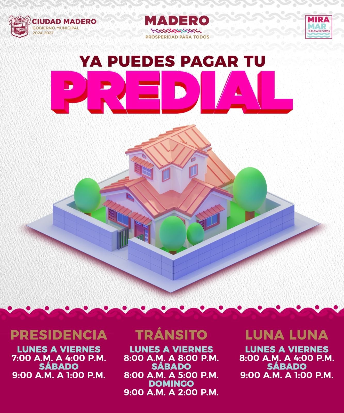 Asimismo, González Robledo recalcó que el pago oportuno del predial permite fortalecer las finanzas municipales y se refleja en más obras, mejores servicios públicos y acciones que contribuyan al desarrollo y progreso de Ciudad Madero. Por lo que hizo la invitación a la población a aprovechar los beneficios que fueron aprobados por el Cabildo de la Ciudad y cumplir con esta obligación fiscal. Los horarios están disponibles de lunes a viernes. Mientras que también para mejor comodidad de sábado y domingo.