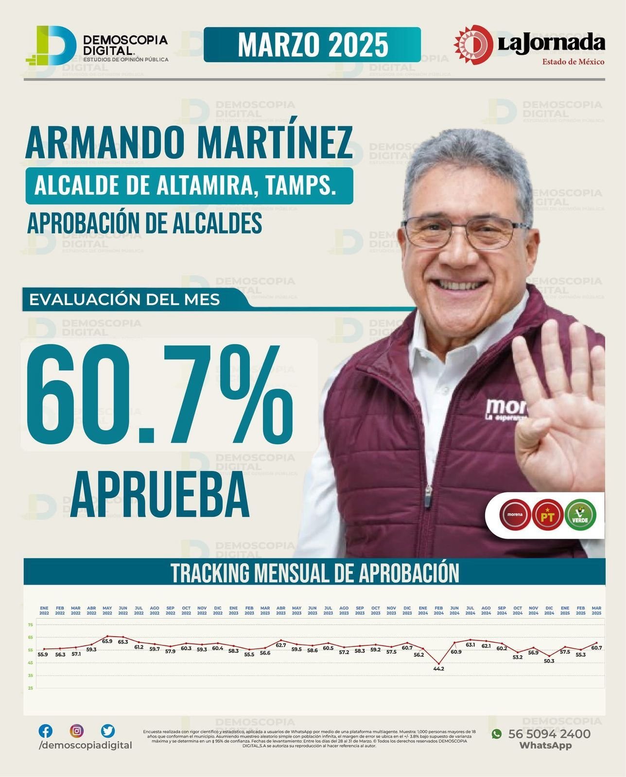 En el reciente estudio realizado por DEMOSCOPIA DIGITAL, S.A., un sitio especializado en encuestas con un enfoque científico y estadístico, se dio a conocer que el presidente municipal de Altamira, Dr. Armando Martínez Manríquez, lidera la aprobación de alcaldes en el estado de Tamaulipas durante el mes de marzo del presente año, con un destacado 60.7 por ciento de respaldo por parte de la ciudadanía.