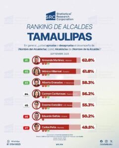 El presidente municipal de Altamira, Dr. Armando Martínez Manríquez, se colocó como el alcalde mejor evaluado de Tamaulipas, según el más reciente estudio de la casa encuestadora Statistical Research Corporation, correspondiente al mes de septiembre de 2025. Con una aprobación ciudadana del 62.8%, Martínez Manríquez encabeza el ranking estatal de desempeño, superando a Mónica Villarreal Anaya, alcaldesa de Tampico (61.8%), y a Alberto Granados, de Matamoros (58.3%).