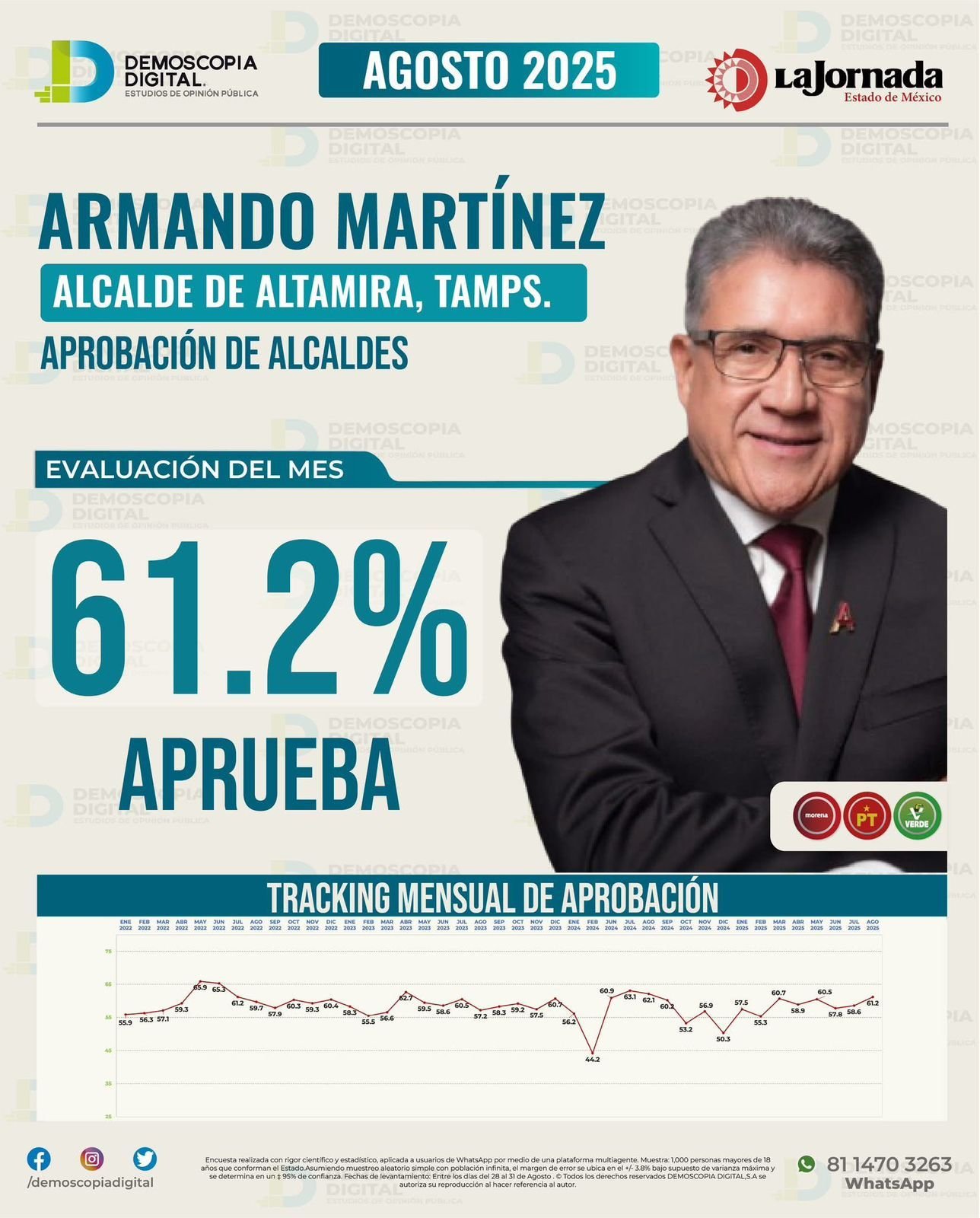 El presidente municipal de Altamira, Dr. Armando Martínez Manríquez, se posicionó como el alcalde mejor evaluado de Tamaulipas, de acuerdo con el más reciente estudio realizado por la casa encuestadora Demoscopia Digital, correspondiente al mes de agosto de 2025.