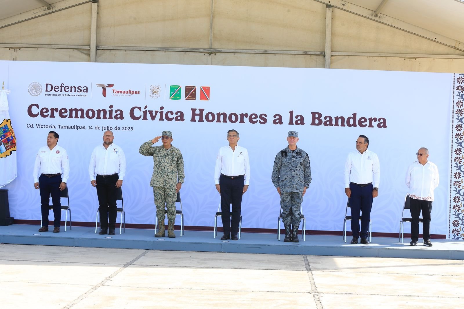 En la ceremonia cívica también estuvieron presentes: Jesús Amparán Hernández, coordinador estatal de la Guardia Nacional en Tamaulipas; Héctor Joel Villegas González, secretario general de Gobierno; Hernán De la Garza Tamez, presidente del Supremo Tribunal de Justicia; Francisco Adrián Cruz Martínez, presidente de la Diputación Permanente del
