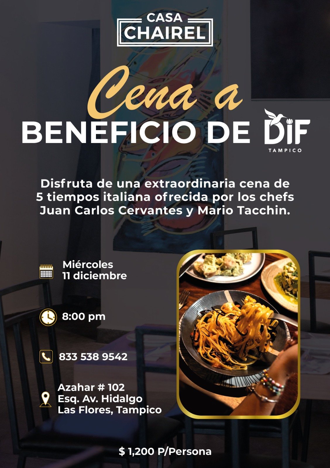Con el objetivo de apoyar al Sistema DIF Tampico en el fortalecimiento de los programas de asistencia social, el restaurante Casa Chairel, ofrecerá el próximo miércoles 11 de diciembre, una cena de alta cocina en beneficio del organismo.Luz Adriana Villarreal Anaya, Presidenta del DIF municipal dio a conocer que el evento se llevará a cabo en las instalaciones del restaurante, ubicadas en calle Azahar #102 esquina Avenida Hidalgo de la colonia Las Flores; donde se ofrecerá una cena italiana de cinco tiempos elaborada por los distinguidos chefs, Juan Carlos Cervantes y Mario Tacchin.La titular del organismo agradeció a Casa Chairel el interés de realizar esta cena de beneficio; y extendió la invitación a la ciudadanía y a los diferentes sectores de la sociedad a sumarse a esta noble causa.»Agradezco a Casa Chairel realizar esta actividad que tiene como objetivo recaudar fondos que aplicaremos en nuestros programas de beneficio a la población vulnerable «, explicó.Villarreal Anaya, señaló que la cena de beneficio iniciará en punto de las 8:00 de la noche y el costo por persona para degustar los exquisitos platillos italianos, será de $1,200 pesos.»Mi agradecimiento además para los chefs Mario Tacchin y Juan Carlos Cervantes, quienes serán los encargados de preparar el menú italiano que disfrutaremos y que además permitirá a los asistentes apoyar al DIF Tampico», señaló.Luz Adriana Villarreal Anaya subrayó que la suma de iniciativas y esfuerzos en beneficio de los grupos vulnerables, contribuye significativamente a disminuir las brechas sociales y a elevar la calidad de vida de las personas y familias más desprotegidas; pero sobretodo, fortalece la visión humanista que, dijo, hoy transforma a Tamaulipas, en una entidad que privilegia la prosperidad compartida.Reiteró, por último la invitación a quienes deseen sumarse de corazón en apoyo al organismo a que asistan el próximo 11 de diciembre a Casa Chairel; o bien soliciten información al respecto al teléfono 833 538-9542.