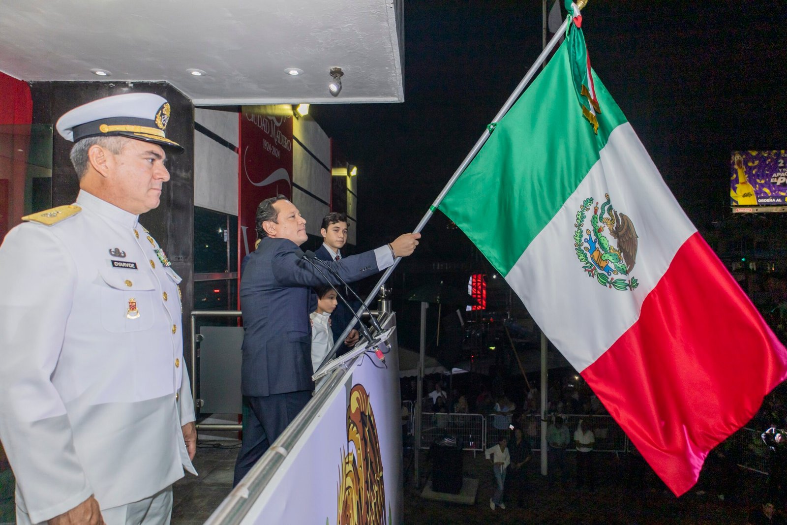 El corazón de los maderenses vibró la noche de este 15 de septiembre, con la ceremonia del Grito de Independencia, presidida por el presidente en función Carlo Alberto González Portes, quien hondeó con firmeza la Bandera Nacional en honor a todos los héroes que lucharon por la libertad de México.La iluminación tricolor cubrió el edificio presidencial de Ciudad Madero, donde se dieron cita síndicos, regidores, directores municipales, autoridades navales y militares, así como la población en general para atestiguar esta tradicional celebración que nos une como mexicanos.En el acto protocolario, el Presidente Municipal recibió el símbolo patrio y acompañado por su familia, por el secretario del Ayuntamiento Juan Antonio Ortega Juárez, así como por autoridades de la Guardia Nacional, la Secretaría de Marina y el Ejército Mexicano, se dirigió al balcón presidencial para ondear la Bandera Nacional recordando la lucha de nuestros héroes que defendieron los derechos y libertades de cada mexicano. “Mexicanos, maderenses, vivan los héroes que nos dieron patria y libertad, viva Hidalgo, viva Morelos, viva Josefa Ortiz de Domínguez, viva Allende, viva Aldama, viva Galeana y Matamoros, viva Guerrero, viva la Independencia Nacional, viva Madero, viva Tamaulipas, viva México”, entonó el alcalde maderense.Luego del toque de campana, los asistentes entonaron con júbilo el Himno Nacional Mexicano, para posteriormente disfrutar de un espectáculo de pirotecnia que  emocionó a todos los presentes. Cabe mencionar que a lo largo de esta conmemoración, la ciudadanía estuvo resguardada por elementos de la Policía Estatal, Guardia Nacional, además de elementos de Protección Civil, Bomberos y Tránsito.En este evento, también se disfrutó de una Mega Lotería Mexicana, así como la presentación del Grupo Dizztinto, además de una verbena popular.
