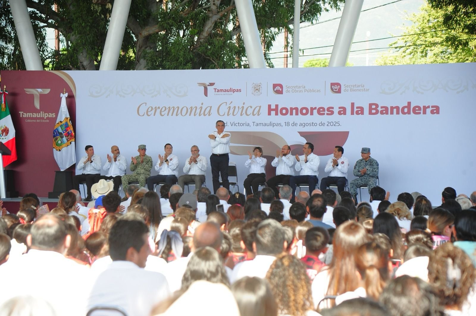 Que esta inauguración sea muestra de una verdad sencilla y contundente: mientras algunos levantan sombras, nosotros levantamos techumbres; mientras algunos siembran dudas, nosotros sembramos futuro”, expresó. Y sentenció: “Frente a la difamación, respondemos con transparencia; frente a la insinuación, respondemos con puertas abiertas, información pública y obra de calidad a la vista de todas y todos. Nuestra conducta es clara y nuestro compromiso es con la verdad y con Tamaulipas”. Al término de la ceremonia de honores, el gobernador ingresó al gimnasio Manuel Raga, en donde convivió con integrantes del equipo de cachibol Águilas de Fuego y con el equipo de basquetbol Panteras. En la ceremonia cívica acompañaron al gobernador: Silvia Casas González, secretaria de Bienestar Social; Humberto Prieto Herrera, presidente de la Junta de Gobierno del Congreso del Estado; Hernán de la Garza Tamez, presidente del Supremo Tribunal de Justicia; Héctor Joel Villegas González, secretario general de Gobierno; el diputado federal José Braña Mujica; Francisco Adrián Cruz Martínez, presidente de la Mesa Directiva del Congreso; Marcelo Abundiz Ramírez, presidente de la Comisión de Infraestructura y Desarrollo Urbano; general Enrique García Jaramillo, comandante de la 48 Zona Militar; y el coronel Daniel Lugo, jefe de Coordinación Policial, en representación del coordinador estatal de la Guardia Nacional. También asistieron integrantes de la Mesa de Construcción de Paz y miembros de la Cámara Mexicana de la Industria de la Construcción, encabezados por el titular de la CMIC Victoria, Jorge Adán Contreras Galván, y el tesorero de la Delegación Tamaulipas-Centro, Ramiro Hernández Valencia.