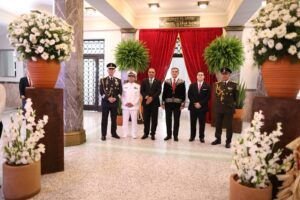 Desde la escalinata principal de Palacio de Gobierno, el gobernador de Tamaulipas recibió la bandera nacional de manos de la escolta del 77 Batallón de Infantería y exclamó. «¡Tamaulipecos, tamaulipecas!,