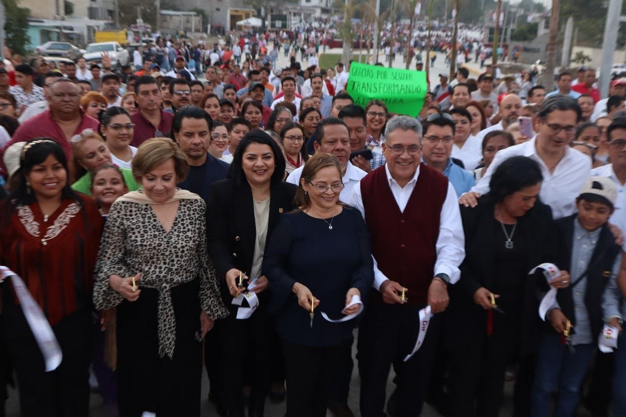 Altamira, Tamaulipas.- En el marco del séptimo informe de trabajo del Presidente Municipal de Altamira Armando Martínez Manríquez, la Presidenta de la Junta de Gobierno en el Congreso Estatal Úrsula Salazar, destacó el importante trabajo que realiza el munícipe, afirmando que la Cuarta Transformación se nota en la urbe industrial. “Armando realiza un gran trabajo en Altamira, lo vemos todos los días con las inversiones que se realizan en infraestructura, en desarrollo social, en obras y beneficios para los altamirenses; Y desde el congreso continuaremos respaldando el importante esfuerzo aprobando los proyectos que sean necesarios para continuar con la transformación.” Señaló la Diputada de Tampico, quien compartió la línea de honor junto a los Diputados Federales Erasmo González Robledo y Blanca Narro, la Senadora Lupita Covarrubias, y la Presidenta del Sistema DIF Altamira Rossy Luque de Martínez. El Alcalde de Altamira Armando Martínez, mencionó en su mensaje un agradecimiento público a Úrsula Salazar por el apoyo brindado a los proyectos presentados por el municipio, mismos que han sido aprobados por el Congreso Estatal, anunciando además, que será el próxima semana cuando se apruebe la construcción de un nuevo auditorio municipal.En el evento que se realizó en la colonia Miramar en el municipio de Altamira, se cortó también el listón que deja inaugurado el Paseo Nochebuena, una nueva vialidad que se extiende hasta la salida a la Avenida de la Industria junto al Fraccionamiento Los Encinos, misma que por muchos años se encontró en el abandono, y que ahora beneficia de manera directa a este importante sector de la población.