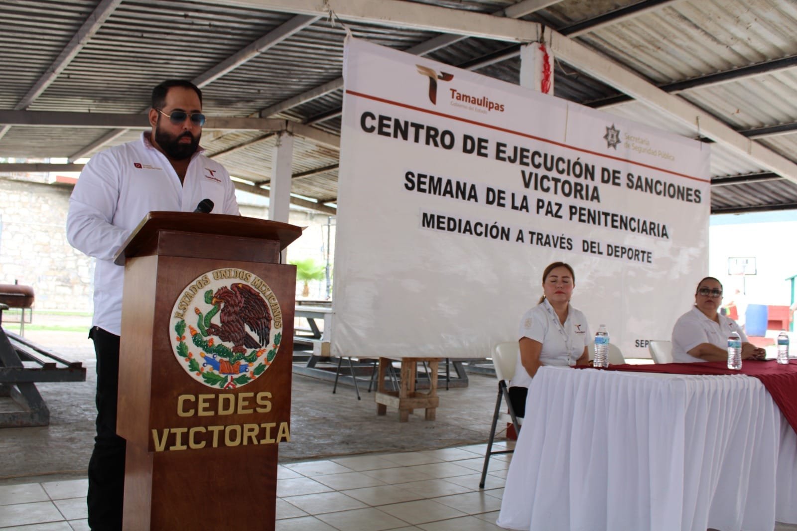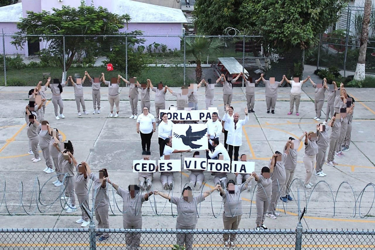Ciudad Victoria, Tamaulipas. – En el marco del Día Internacional de la Paz, los Centros de Ejecución de Sanciones (CEDES) de Tamaulipas desarrollaron una serie de actividades artísticas y culturales para promover este valor entre las personas privadas de la libertad (PPLs) durante la denominada “Semana de la Paz Penitenciaria”. Adicional a las actividades deportivas celebradas con anterioridad, en el área femenil del CEDES Victoria se formó un corazón gigante integrado por mujeres privadas de la libertad y titulares de las jefaturas de departamento del centro, representando el trabajo conjunto que ambas partes realizan para lograr la reinserción social. El mensaje gráfico incluyó la leyenda “CEDES Victoria por la Paz”; cuyo mensaje se profundizó con la lectura del libro