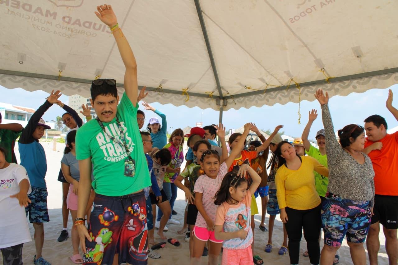 Durante la jornada, los asistentes participaron en dinámicas con títeres, cantos y cuentos sobre el cuidado del océano, así como talleres de manualidades con materiales reciclados, juegos gigantes, esculturas en arena y espacios de lectura y pintura. Más de 60 niñas, niños y jóvenes muy especiales para el sistema DIF y Gobierno Municipal, con diferentes tipos de discapacidad entre ellas parálisis cerebral infantil, discapacidad motriz, déficit intelectual, síndrome de