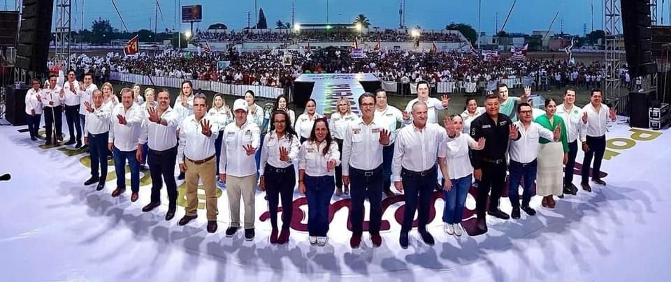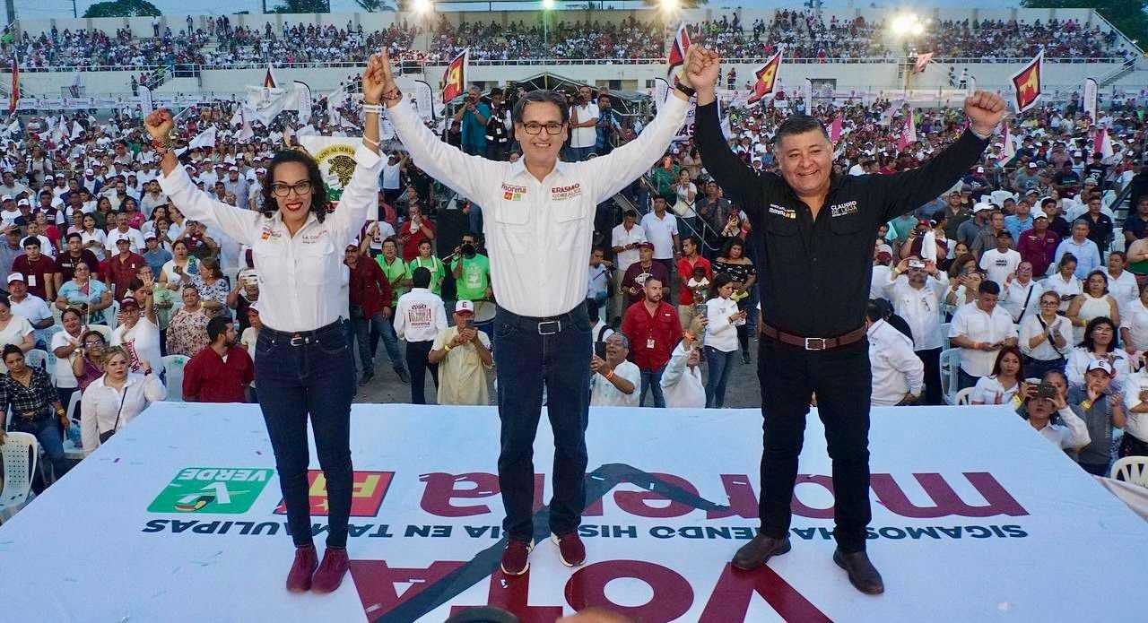 El evento, que reunió a miles de personas entre simpatizantes, liderazgos, sectores sociales y figuras destacadas de la política en Madero, marcó la recta final de una intensa jornada de actividades proselitistas.La fórmula ganadora de la coalición “Sigamos Haciendo Historia en Tamaulipas” está representada por Erasmo González Robledo, candidato a la alcaldía de Ciudad Madero; Adrián Oseguera Kernion, candidato a diputado federal por el distrito 08; Claudio de Leija, candidato a diputado local por el distrito 20; y JR José Ramón Gómez