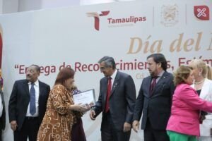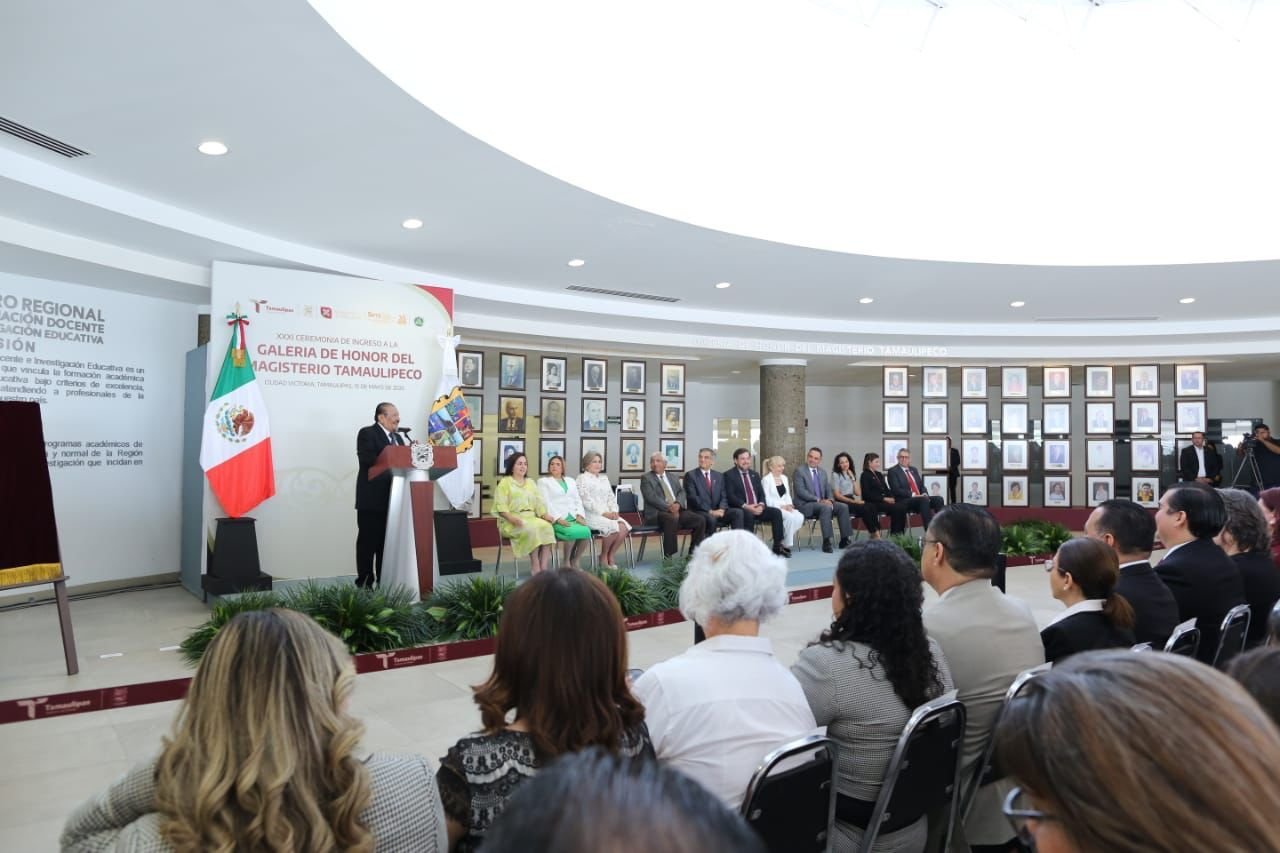 Por la mañana, en el Centro Regional de Formación Docente e Investigación Educativa (CRETAM), Villarreal Anaya presidió la ceremonia de ingreso a la Galería de Honor del Magisterio Tamaulipeco, y entregó reconocimiento y la medalla Lauro Aguirre a la galardonada de Educación Básica, doctora María de Jesús Lara Tijerina, y a la doctora Lucila Olvera Flores, galardonada de Educación Media Superior y Superior.