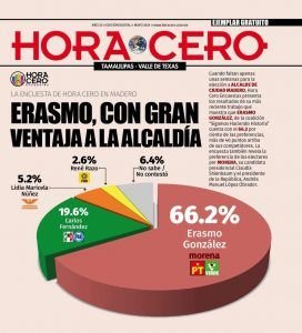 ad Madero, Tam.- A menos de un mes de la elección, Erasmo González, candidato de la coalición “Sigamos Haciendo Historia” a la alcaldía de Ciudad Madero, aparece como el favorito de los electores para ganar los comicios al contar con una ventaja de 46.6 puntos porcentuales.
