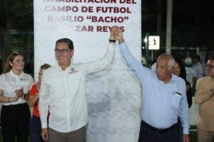 Entre estas mejoras se encuentran el gimnasio “El Mexicano” y la cancha de fútbol de pasto sintético, que rinde homenaje al legendario Basilio “El Bacho” Salazar Reyes. Estas obras forman parte de una inversión cercana a los 22 millones de pesos, que transformar la Unidad Deportiva y el gimnasio “Benito Juárez” como parte del plan de inversión pública para 2025.
