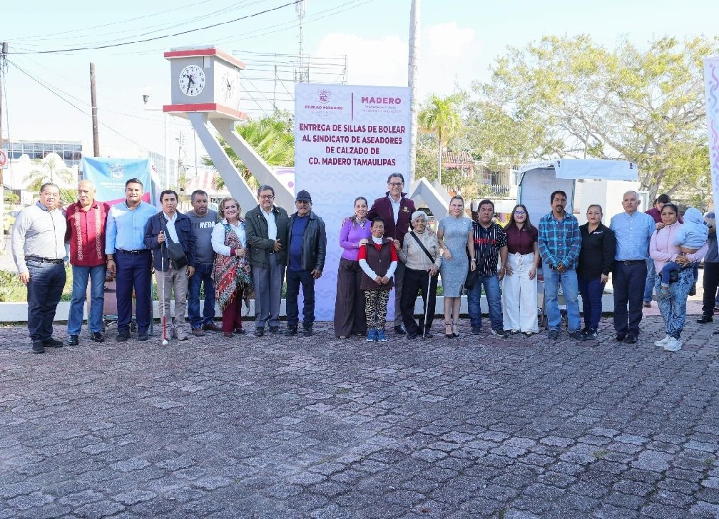 Para dignificar las condiciones de trabajo de quienes diariamente ofrecen sus servicios en el primer cuadro de la ciudad, el presidente municipal, Erasmo González Robledo, acompañado por su esposa, la presidenta del Sistema DIF Madero, Lic. Dunia Marón Acuña, realizó la entrega de ocho sillas de bolear a trabajadores pertenecientes al Sindicato de Aseadores de Calzado de Ciudad Madero, quienes se ubican alrededor de la presidencia municipal. Durante este acto, el munícipe reconoció la importancia de este gremio, que forma parte de la vida cotidiana y de la historia de Ciudad Madero desde el año 1963.“En general, los aseadores de calzado son amigos de la ciudad, así los consideramos y hoy el Gobierno de la Ciudad y su Cabildo les hace entrega de un equipamiento para que tengan un mejor servicio, para que también dignifiquen su actividad”, expresó. Cabe hacer mención que desde hace más de 40 años esta organización sindical es encabezado por doña Celia Gómez Cervantes, una mujer comprometida, trabajadora y con un firme ánimo de servir a su comunidad. La entrega de este apoyo se llevó a cabo en la explanada de la Presidencia Municipal y se contó con el respaldo del Cabildo de la ciudad, como parte de las acciones impulsadas por el Gobierno Municipal para mejorar las herramientas de los trabajadores, permitiéndoles desempeñar su oficio en condiciones dignas. Por su parte, doña Celia Gómez Cervantes agradeció el respaldo otorgado por el jefe de la comuna maderense y por síndicos y regidores, destacando que estas nuevas sillas les permitirán trabajar con dignidad y brindar un mejor servicio a la ciudadanía que acude diariamente a la zona centro. Al finalizar el evento, González Robledo convivió con los integrantes del sindicato y en un gesto de cercanía y en reconocimiento a su labor, se boleó los zapatos con uno de los aseadores beneficiados, reafirmando su compromiso de trabajar cerca de los maderenses.
