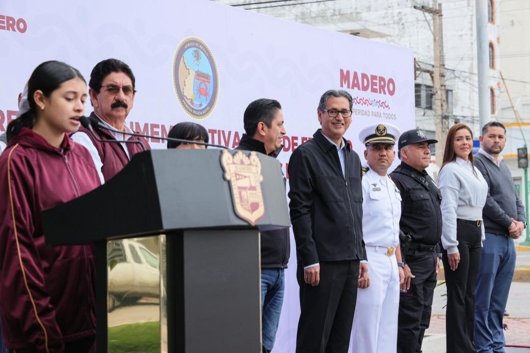 En su participación, la alumna Daniela Vicencio García, recordó que “la Constitución Política de los Estados Unidos Mexicanos no nació en tiempos de calma, sino cuando la desigualdad era cotidiana, cuando la injusticia era normalizada y cuando el país entendió que la fuerza no podía seguir gobernando al derecho”. A la ceremonia asistió el Dr. José Manuel Sierra Castillo, en representación de la presidenta del Sistema DIF Madero, Lic. Dunia Marón Acuña; así como el Cap. de Corbeta Aeronáutica Naval, Emmanuel Pérez Moctezuma, en representación del Vicealmirante Miguel Rivas Hernández, comandante de la Primera Zona Naval; el Suboficial Fernando Luján Portes, coordinador de la Guardia Estatal en
