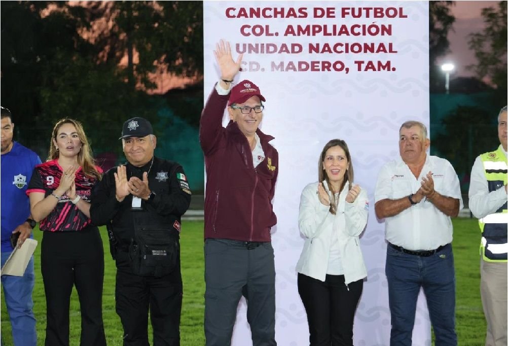 Como parte del firme compromiso de impulsar el deporte y brindar espacios dignos para la niñez y la juventud maderense, el presidente municipal Erasmo González Robledo, acompañado por la presidenta del Sistema DIF local, Lic. Dunia Marón Acuña, entregó la rehabilitación de 2 canchas de fútbol en el parque de la colonia Ampliación Unidad Nacional.