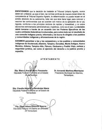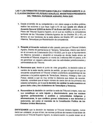 En su solicitud, las autoridades destacaron revocar el acuerdo y mantener la sede en Altamira: solicitando que se deje sin efecto el acuerdo que modifica la sede y competencia territorial del Tribunal Unitario Agrario del Distrito 30, argumentando que la medida no responde a criterios de justicia social y equidad.