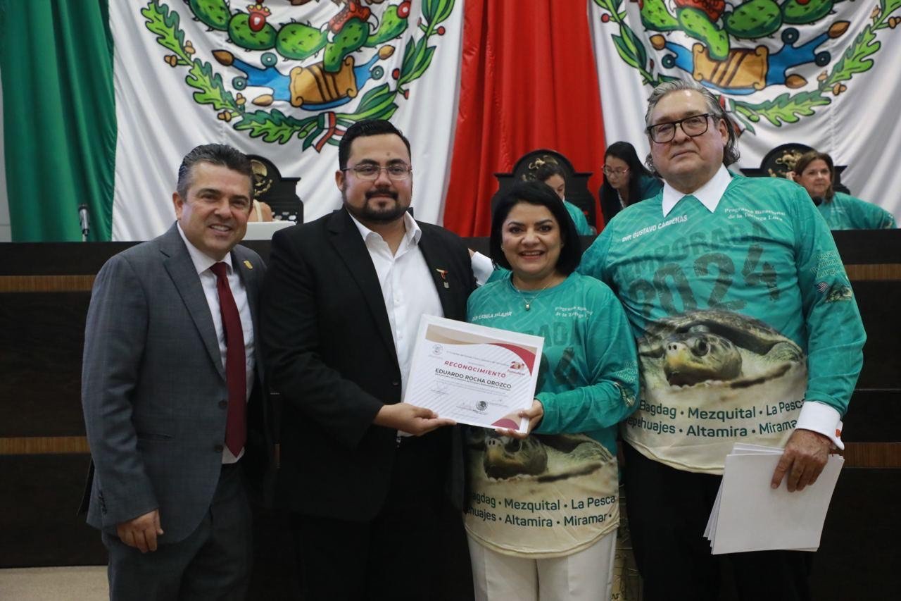 Ciudad Victoria, Tamaulipas. – Ante los logros alcanzados que se han traducido en educación, conservación y liberación de más crías de tortugas lora cada año en playas tamaulipecas, legisladores del Congreso de Tamaulipas hicieron un reconocimiento público a los organismos involucrados.Diputadas y diputados locales reconocieron el trabajo binacional en pro de la tortuga lora que realizan el Zoo Gladys Porter de Brownsville, Texas, a cargo de Patrick Burchfield, y la Comisión de Parques y Biodiversidad de Tamaulipas (CPBT), que preside Eduardo Rocha Orozco. Cabe destacar que de los ocho campamentos tortugueros en el estado, la Comisión tiene bajo su resguardo seis: en el municipio de Soto la Marina, playa La Pesca y Tepehuajes; en Altamira, en Miramar en Ciudad Madero y en Matamoros, Playa Bagdad y El Mezquital.En la tribuna del Congreso de Tamaulipas, Gustavo Cárdenas presentó la iniciativa del reconocimiento, por la noble labor de conservación y preservación de la tortuga lora en las costas de Tamaulipas y por hacer de esta especie un símbolo para la entidad.A la iniciativa se adhirieron todos los diputados y diputadas de las diversas fracciones partidistas, quienes además portaron el jersey conmemorativo con la leyenda: “Temporada 2024 de la Tortuga Lora”.Al respecto, Eduardo Rocha Orozco, vocal de la Comisión de Parques y Biodiversidad de Tamaulipas, refirió que: “No solo se trata de crear conciencia entre la población del cuidado de la fauna, sino de hacerla participativa y colaborativa, tal como lo señala el gobernador Américo Villarreal Anaya, para tener una mejor sociedad, fincada en los valores y las buenas costumbres”.José Luis Dávila del Gladys Porter Zoo señaló la importancia del trabajo coordinado en pro de especies consideradas en peligro de extinción, como es el caso de la tortuga lora.