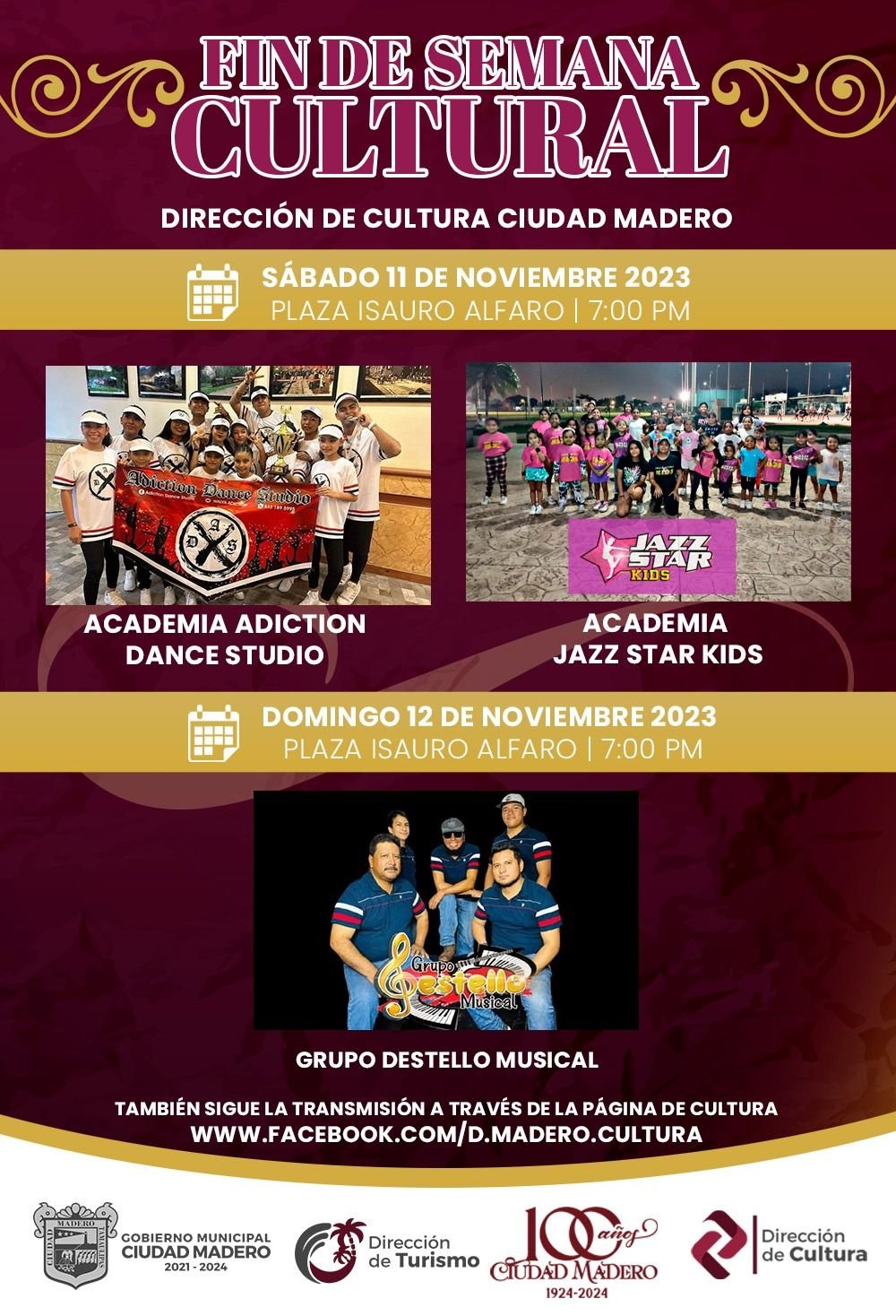 Para seguir promoviendo el arte y la cultura a través de la música y el baile, el Gobierno Municipal, invita a las familias maderenses a presenciar un evento artístico en la emblemática Plaza Isauro Alfaro Otero, este sábado 11 y domingo 12 de noviembre.De acuerdo al titular de la dependencia, Hugo Medellín Flores, el objetivo de estas actividades es fortalecer el tejido social, ya que con estas actividades se brinda un momento de sano esparcimiento y además se apoya el talento local.Explicó que la oferta cultural iniciará con la presentación de los integrantes de las Academia Adiction Dance Studio y Jazz Star Kids, quienes realizarán una demostración de baile moderno.Mientras que el segundo día se contempla la participación del Grupo Destellos Musical, con un repertorio de melodías que han sido éxito y que serán del agrado del público.Por último, el funcionario municipal señaló que la ciudadanía también puede apreciar el programa cultural desde la comodidad de su hogar, por medio de la página oficial de la Dirección de Cultura, en Facebook.