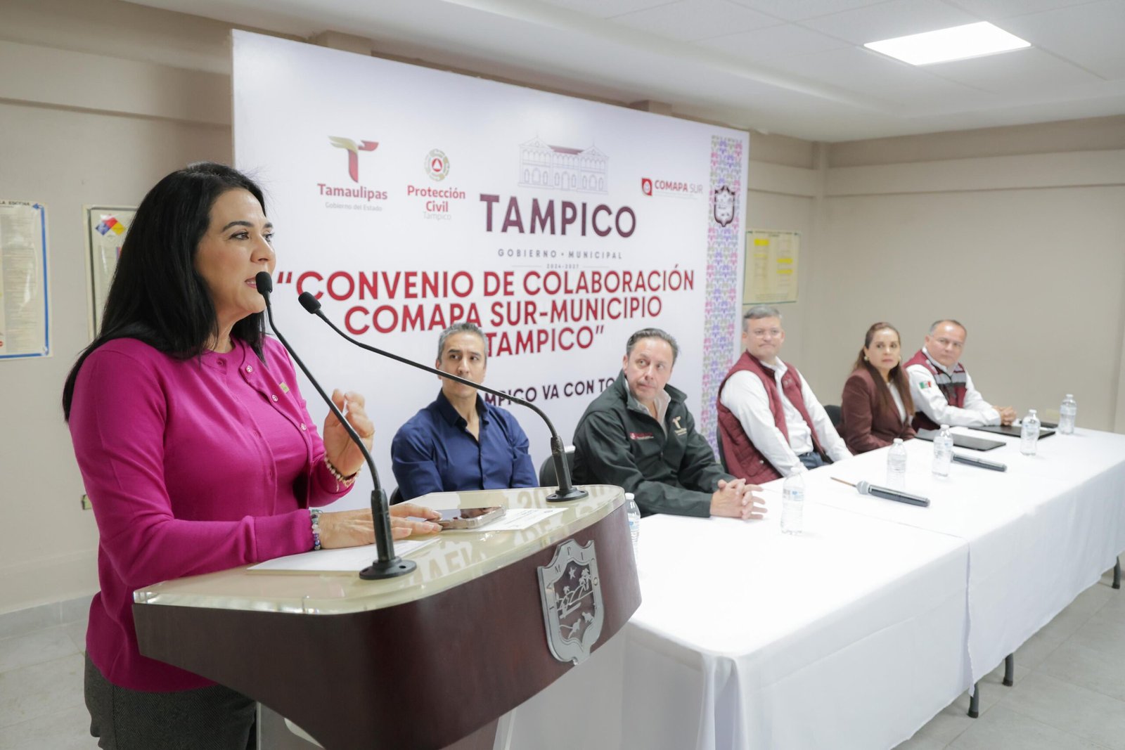 Con el objetivo de fortalecer la capacidad operativa del Heroico Cuerpo de Bomberos de Tampico, la Presidenta municipal Mónica Villarreal Anaya suscribió un convenio de colaboración con la Comisión Municipal de Agua Potable y Alcantarillado de la zona conurbada -COMAPA Sur-, mediante el cual, el organismo operador pondrá a disposición de la corporación cuatro pipas para la atención de siniestros. En el acto efectuado en el cuartel general de Bomberos, la alcaldesa estuvo acompañada del Gerente General de Comapa Sur, Francisco José González Casanova; así como del Gerente administrativo de la dependencia, Sergio Luis Villarreal; el Secretario General del Ayuntamiento, Carlos Alberto García Porres; la Síndico Segundo, Laura Elena Ramírez Sánchez y el Director de Protección Civil municipal, José Antonio Marín Flores.Ahí, Mónica Villarreal agradeció la colaboración solidaria de Comapa Sur y destacó que por primera vez en el municipio se establecen acuerdos de esta naturaleza en beneficio de la ciudadanía.»Hoy damos ejemplo y testimonio de otro beneficio más de tener alineados los tres órdenes de gobierno, donde se establece una comunicación estrecha y una colaboración genuina; y donde los resultados van a ser para mejorar las condiciones de nuestro municipio. Sin duda que este convenio es para celebrarse y para darnos cuenta que es una acción inédita que favorece a todos los tampiqueños».Detalló que mediante este acuerdo, Comapa asume el compromiso de poner a disposición del cuerpo de Bomberos, cuatro unidades tipo pipa, para que sean utilizadas en el combate a incendios, a fin de ampliar la cobertura y capacidad de respuesta por parte de la corporación.Villarreal Anaya, dijo que en los últimos tres meses se han atendido alrededor de 85 conflagraciones en distintos puntos de la ciudad, sin que hayan alcanzado una connotación mayor, sin embargo precisó, que contar con la disponibilidad de más unidades, contribuirá a salvaguardar la seguridad de los tampiqueños.Explicó que a las cuatro unidades disponibles se les adaptarán las mangueras y bombas necesarias, para que estén en condiciones de prestar un servicio eficiente y oportuno. Por su parte, Francisco José González Casanova señaló que con este tipo de sinergias, se busca construir un entorno más seguro y preparado para enfrentar los retos que se susciten en materia de emergencias e incendios.“La firma de este convenio no sólo formaliza el esfuerzo conjunto entre nuestras instituciones, sino que también refuerza nuestro compromiso por servir a Tampico con eficiencia y responsabilidad. Cuando trabajamos en equipo, cuando unimos recursos, capacidades y voluntades, logramos mucho más que sólo cumplir con nuestras obligaciones”, puntualizó.