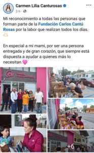 La Fundación CCR en honor al patriarca de los Canturosas habría sido fundada hace 11 años, según una felicitación publicada por la alcaldesa en la página de Facebook de ese organismo fechada el pasado 16 de marzo.Llama la atención que la propia página de FB de la Fundación fuera abierta apenas el 24 de agosto de 2022, a medio trienio de la actual administración municipal, siendo que tenía supuestamente 11 años de operación.Según las publicaciones en la página, el organismo es manejado por la matriarca Claudette Villarreal de Cantú y está dedicada a solicitar donativos que distribuye más adelante a nombre de la Fundación, esto es, en lenguaje popular: » saludar con sombrero ajeno».Porque en los comunicados de la Fundación nunca leerán: regalamos, leerán: gestionamos, es decir que la Fundación es un mero intermediario entre lo que la propia sociedad civil dona y los ciudadanos beneficiados. Claro, la palomita se la anotará el membrete: Fundación Carlos Cantú Rosas.Hasta ahí no estaría tan mal, después de todo hay decenas de membretes similares que accionan de manera parecida en la ciudad.