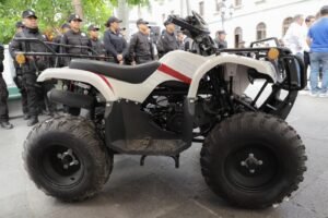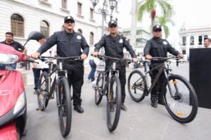 En el evento efectuado en la Plaza de Armas, la alcaldesa porteña, acompañada del Subsecretario de Operación Policial de la Guardia Estatal, Alex Melgarejo Torres, así como del Delegado Regional de la corporación en la zona sur, Inspector José Alfredo Cantero Maldonado, entregó una cuatrimoto 4X4; cinco motocicletas, seis bicicletas y equipo de seguridad complementario.