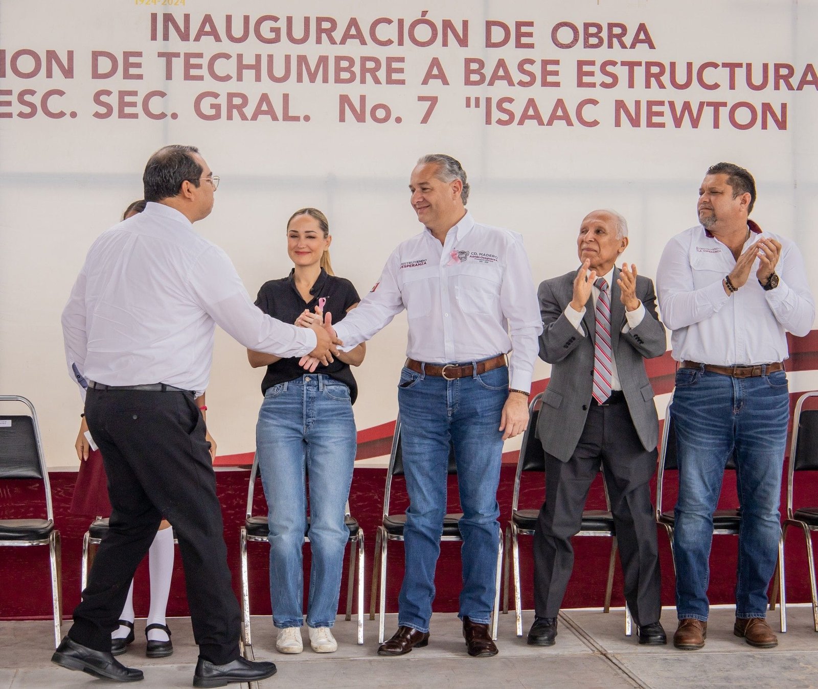 En ese sentido, la mañana de este martes el Presidente Municipal acompañado por su esposa, la Sra. Ana Cristina Organista de Oseguera, realizó la entrega de construcción de techumbre a base de estructura metálica, en la secundaria No. 7 “Isaac Newton”, beneficiando a 626 alumnos.