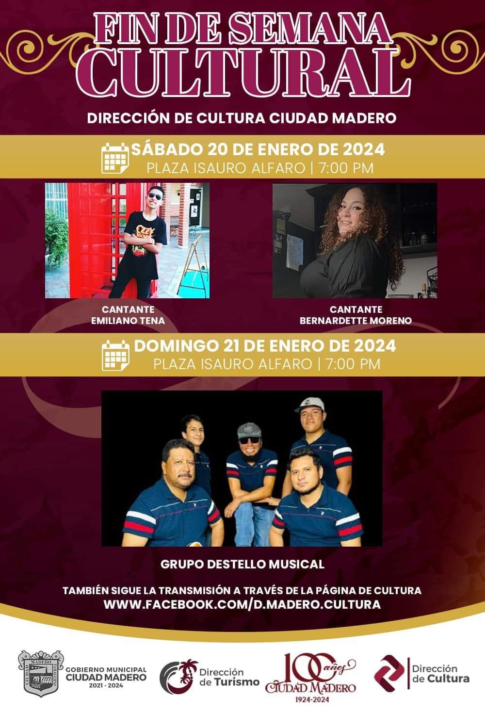 Para impulsar la cultura en Ciudad Madero y fomentar la participación ciudadana a través de eventos artísticos, el Gobierno de Ciudad Madero invita a la población a presenciar un programa de música y baile en la plaza Isauro Alfaro.Al informar lo anterior, el director de Educación y Cultura, Hugo Medellín Flores, señaló que estas actividades son instruidas por el alcalde Adrián Oseguera Kernion, para seguir apoyando el talento local y ofrecer un espacio de sano esparcimiento para las familias del municipio.Agregó que se ha tenido una buena convocatoria por parte de la ciudadanía, quien acude a presenciar de la cartelera cultural que el Gobierno Municipal prepara cada fin de semana.Explicó que para este sábado 20 de enero se contempla la participación de los cantantes Emiliano Tena y Bernardette Moreno, con un repertorio de melodías de antaño.Mientras que el domingo 21 de enero el público podrá apreciar de la actuación del Grupo Destello Musical, que ofrecerá una variedad de éxitos musicales.Finalmente, Medellín Flores refirió que los eventos serán transmitidos a partir de las 7 de la noche a través de la Dirección de Cultura, en Facebook.