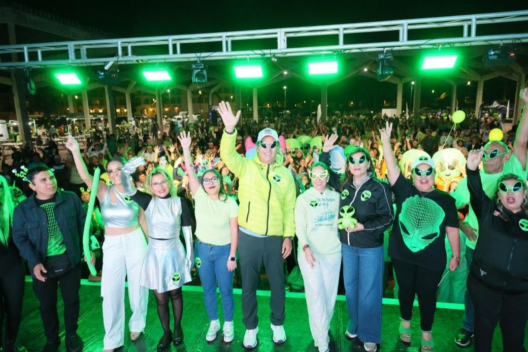 El presidente municipal Erasmo González Robledo, acompañado de su esposa Dunia Marón Acuña, presidenta del sistema DIF Madero, y sus hijas Ana Victoria y María Eliza; celebró un cierre espectacular del Marciano Fest 2025 en la playa Miramar en busca de un récord Guinness.