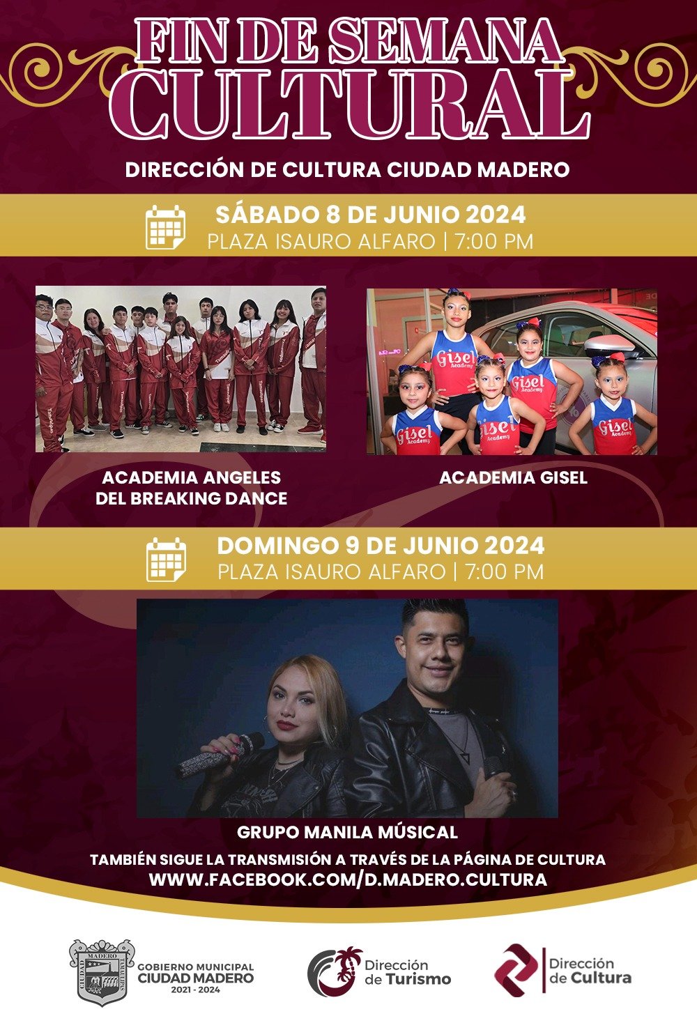 Al continuar promoviendo la cultura a través de la música y el baile, el Gobierno Municipal de Ciudad Madero, invita a las familias a disfrutar de un programa artístico que tendrá lugar este fin de semana en la Plaza Isauro Alfaro.Al informar lo anterior, el Director de Educación Municipal, Hugo Medellín Flores, comentó que esta actividad tiene como propósito impulsar el talento local y ofrecer un momento de esparcimiento a la ciudadanía.Mencionó que la agenda cultural que se ha preparado para el sábado 8 de junio, se contempla la participación de los integrantes de las Academias Gisel y Ángeles del Breaking Dance; en tanto, el domingo 9 de junio se estará presentando el Grupo Manila Musical con un repertorio de melodías que fueron éxito.Destacó que la ciudadanía podrá apreciar la actuación de los artistas desde la comodidad de su hogar, a través de la página oficial de la dependencia, en Facebook.Finalmente, el funcionario municipal, destacó que el Gobierno Municipal, continuará realizando eventos donde se fortalezca el tejido social, mediante eventos donde se fomente el arte y la cultura.