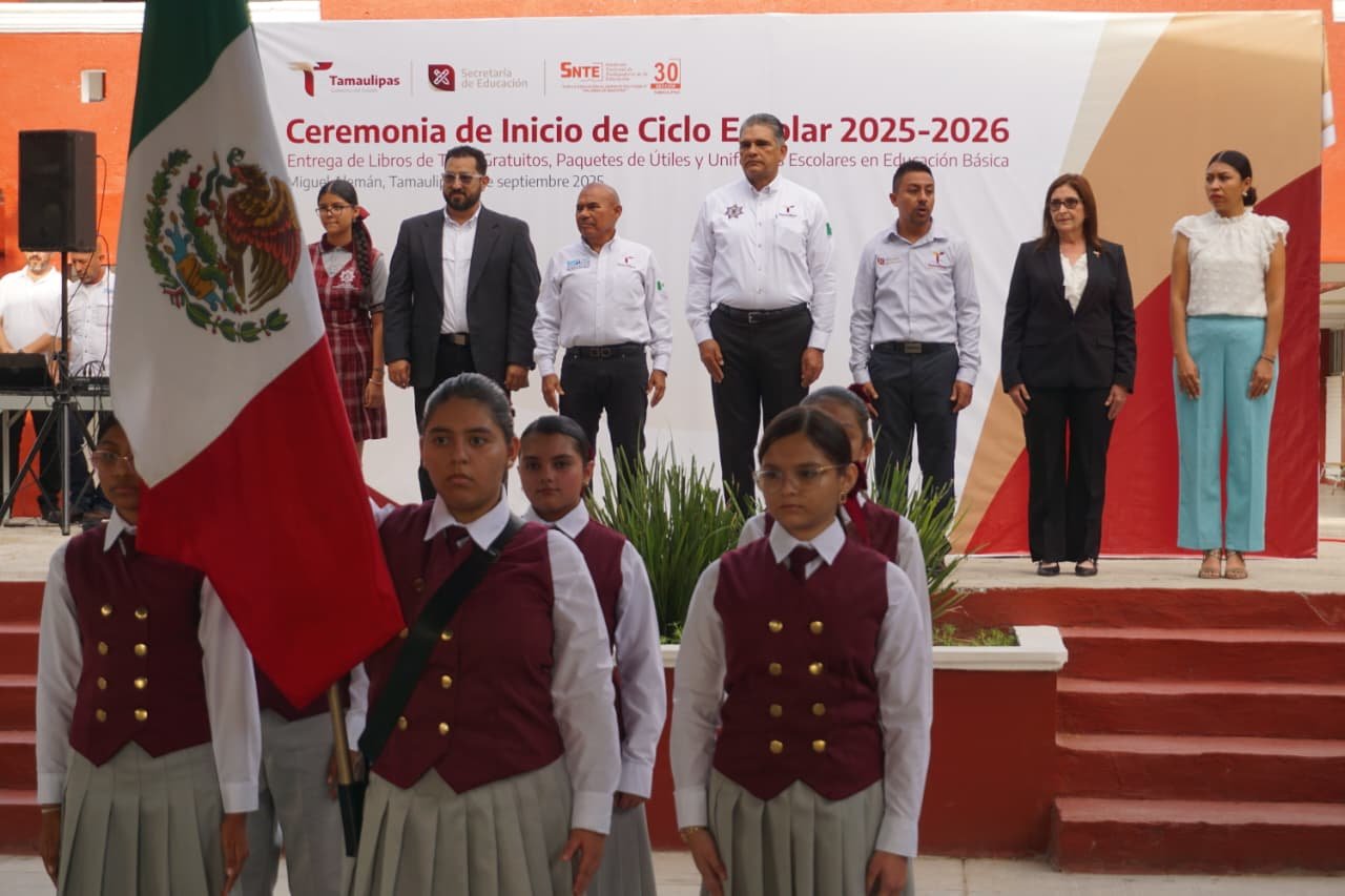 Miguel Alemán, Tamaulipas.- En representación del gobernador Américo Villarreal Anaya, el secretario de Seguridad Pública de Tamaulipas, Carlos Arturo Pancardo Escudero encabezó la ceremonia de inauguración del ciclo escolar 2025-2026 celebrada en la Escuela Secundaria Técnica 49 “Wilfrido Massieu”, ubicada en el municipio de Miguel Alemán.