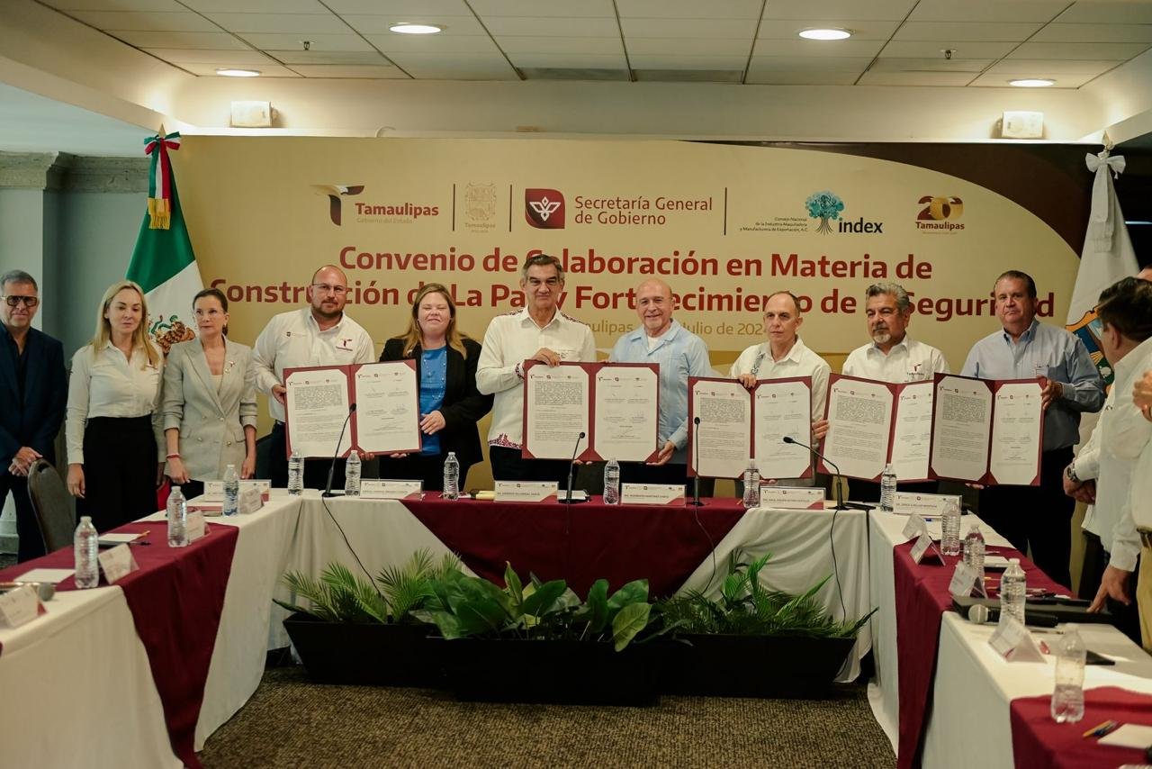 Previo a este evento, se realizó la firma del convenio de colaboración en materia de construcción de la paz y fortalecimiento de la seguridad, entre el Gobierno de Tamaulipas e INDEX.En ese marco, el presidente del Consejo Nacional de la Industria Maquiladora y Manufacturera de Exportación (INDEX), Humberto