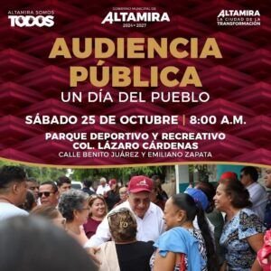 Con el objetivo de fortalecer el diálogo directo con la ciudadanía y atender de manera puntual sus necesidades, el presidente municipal de Altamira, Dr. Armando Martínez Manríquez, anunció el inicio de las audiencias públicas “Un Día del Pueblo”, una nueva estrategia de atención ciudadana que complementará las ya tradicionales audiencias matutinas. El arranque de este programa será el próximo sábado 25 de octubre en punto de las 8:00 de la mañana, en el parque deportivo y recreativo de la colonia Lázaro Cárdenas, ubicado en las calles Benito Juárez y Emiliano Zapata. “Además de las audiencias que otorgamos en las mañaneras, realizaremos audiencias públicas en diversas colonias y ejidos de nuestro municipio para fortalecer más nuestra cercanía con las y los ciudadanos y buscar la solución a sus demandas”, expresó el alcalde.