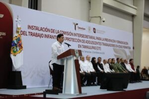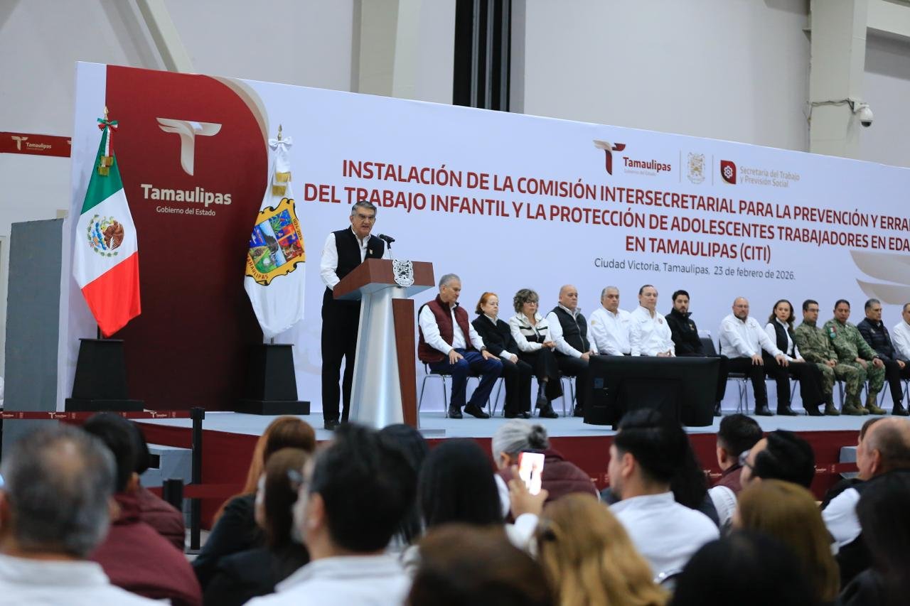 Durante la ceremonia cívica de honores en el Polyforum de esta capital, el gobernador, junto con el secretario del Trabajo, Gerardo Illoldi, y el titular de la Oficina de la Representación Federal del Trabajo en Tamaulipas, Iván Karim Rocha Picazo, firmó el acuerdo que da marco legal y sustento a esta comisión, que representa un mecanismo permanente de coordinación entre dependencias estatales, sectores sociales y la iniciativa privada para atender de manera integral el fenómeno del trabajo infantil, desde un enfoque de derechos humanos y bajo el principio del interés superior de la niñez.