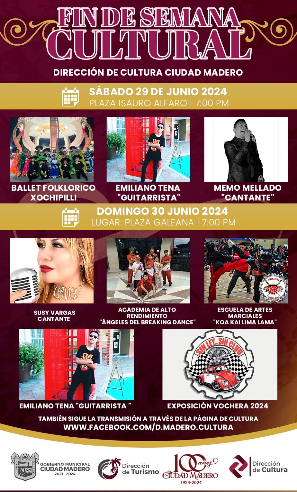 Como parte de las acciones para promover la riqueza cultural de Ciudad Madero, el Gobierno Municipal que preside el alcalde Adrián Oseguera Kernion, fomenta la participación de diferentes grupos artísticos de la localidad con un programa artístico, que tendrá lugar este fin de semana en la Plaza Isauro Alfaro y en la Plaza Galeana. Al informar lo anterior, el Director de Educación y Cultural, Hugo Medellín Flores, comentó que en esta ocasión serán dos sedes donde el público podrá apreciar de la actuación de cantantes, así como bailables de música moderna y folklor.De tal manera, que para este sábado 29 de junio se estarán presentando en la plaza Isauro Alfaro los integrantes del Ballet Folklórico Xochipilli, así como los cantantes Emiliano Tena y Memo Mellado.En tanto, el domingo 30 de junio en la plaza Galena se contempla la participación musical de los cantantes Susy Vargas y Emiliano Tena, además de los alumnos de la Academia de alto rendimiento “Ángeles del Breaking Dance” así como de la Escuela de Artes Marciales “Koa Kai Lima Lama”.Medellín Flores refirió que también el público podrá apreciar la exposición “Vochera 2024” con vehículos de la línea Volkswagen de los años 60, 70, 80, 90 y 2000, así como combis, bugy y Jettas con motor de bochos.Por último, Medellín Flores, señaló que los eventos podrán ser apreciados mediante la página de la dirección de Cultura, en Facebook.