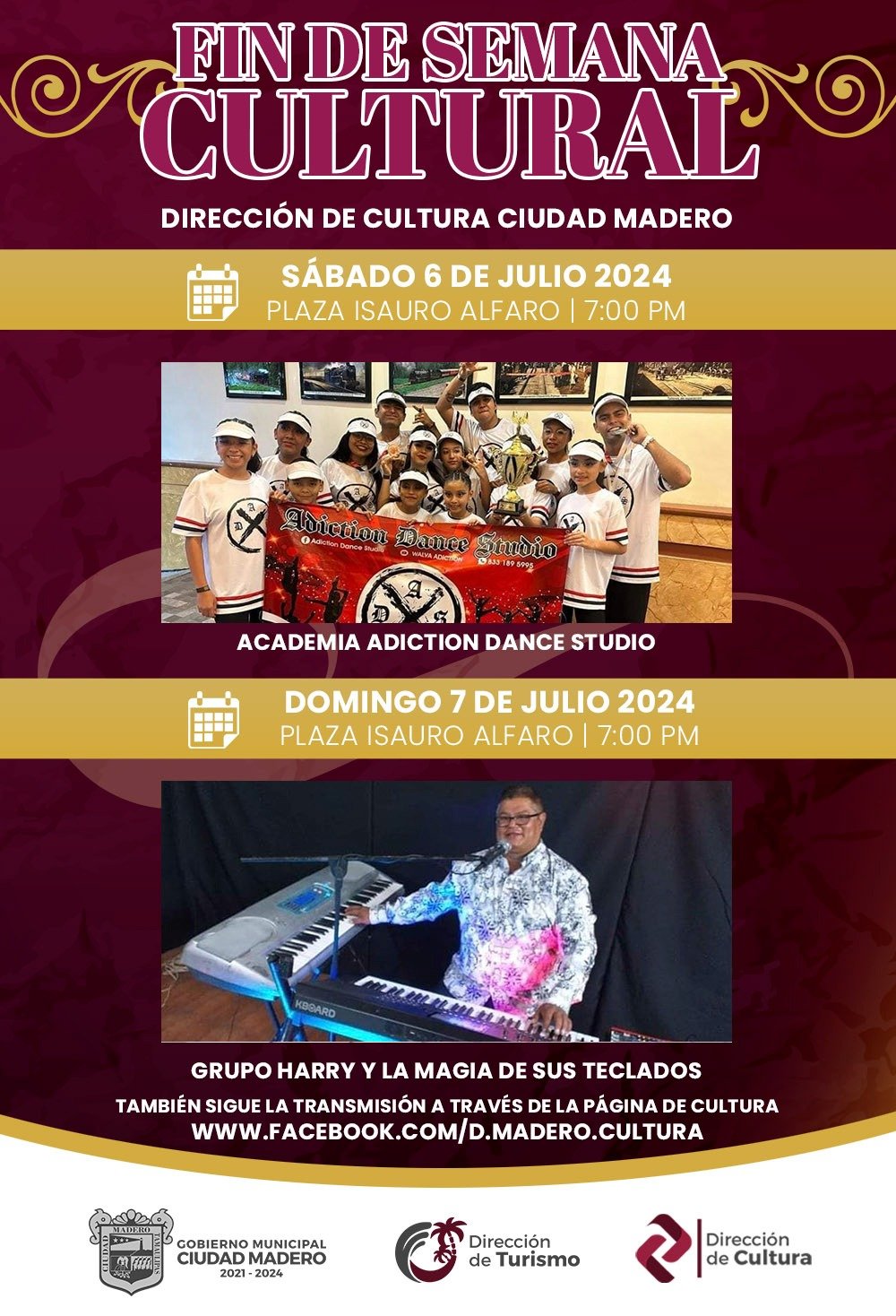 Con la presentación de talentosos artistas de la localidad, familias maderenses podrán disfrutar de un programa cultural que el Gobierno Municipal tiene preparado para este sábado 6 y domingo 7 de julio en la plaza Isauro Alfaro Otero, a partir de las 19:00 horas.Sobre lo anterior, el director de Educación y Cultura, Hugo Medellín Flores, informó que esta actividad tiene como propósito, difundir el arte y fortalecer el tejido social con un momento de sano esparcimiento.Agregó, que la velada comenzará el sábado 6 de julio con la presentación de los talentosos integrantes de la Academia Adiction Dance Studio, quienes sorprenderán a la concurrencia con un número de baile moderno.Asimismo, para el día domingo 7 de julio los asistentes disfrutarán de una tarde con música popular del Grupo Harry y la Magia de sus Teclados.Por último, Medellín Flores mencionó que los eventos serán transmitidos en vivo a través de la dirección de Cultura, en Facebook, a partir de las siete de la noche.