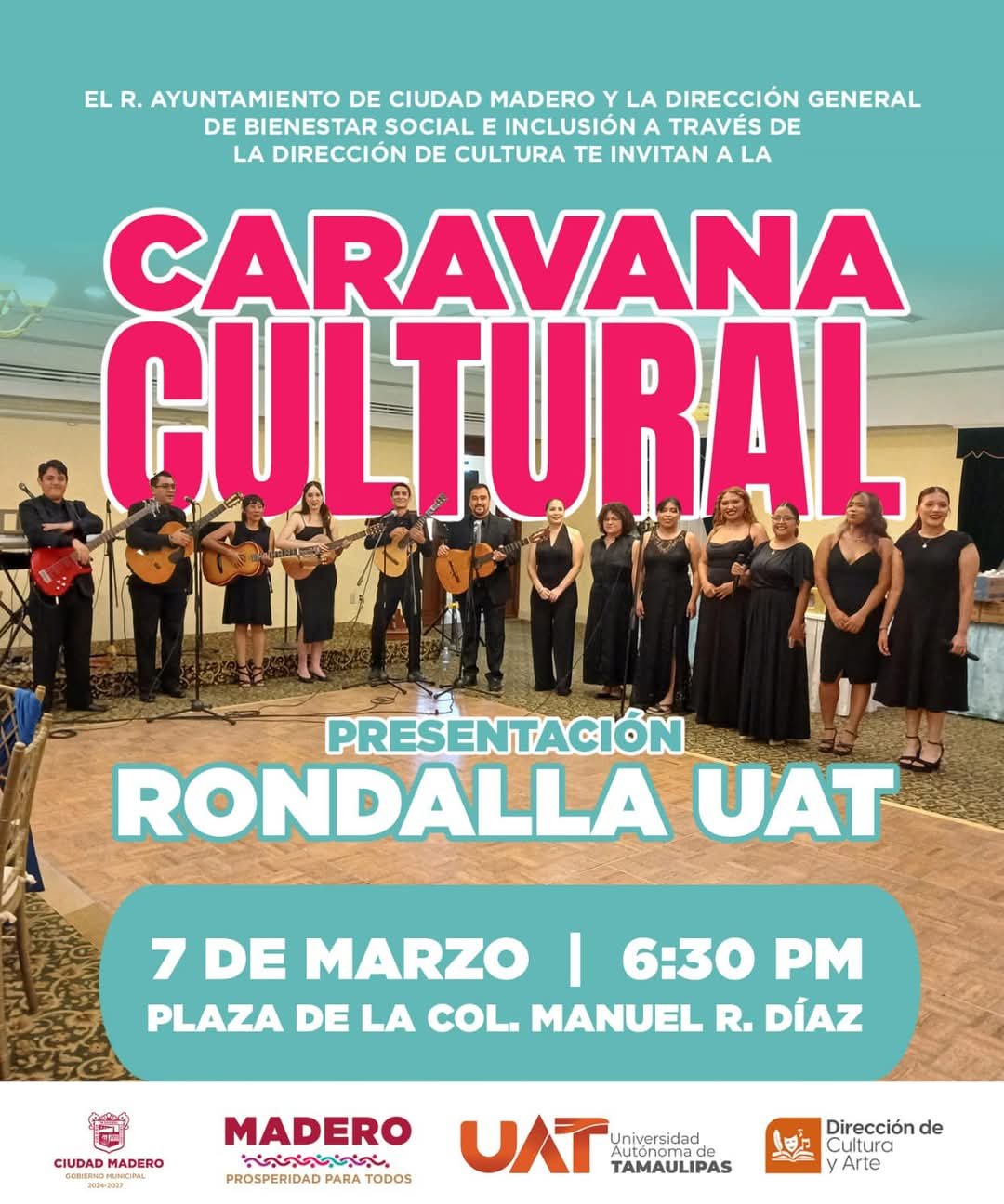 Como parte del programa “Caravana Cultural”, el Gobierno Municipal invita a las familias maderenses a la presentación de la Rondalla UAT, que interpretará canciones románticas de ayer y hoy, bajo la dirección del maestro Eduardo Estrada González; anunció Manuel Chirinos Meza, director de Cultura del Ayuntamiento, al decir que esto es parte de un programa que se estará llevando a diversos sectores del municipio.Dicha actividad cultural se llevará a cabo este viernes 7 de enero a las 6:30 de la tarde en la plaza de la colonia Manuel R. Díaz, punto ideal para que los habitantes de ese sector se reúnan a disfrutar del concierto musical.Chirinos Meza, comentó que, por indicaciones del presidente municipal, Erasmo González Robledo, se trabaja en este tipo de proyectos para la reconstrucción del tejido social y el rescate de espacios para la convivencia, el esparcimiento y la sana recreación.La Rondalla UAT conocida por su talento conmoverá al público con melodías como: serenata, perfidia, sabor a mí, a mi manera, contigo, casi un extraño, tu pecado más nuevo, el primer tonto, contigo en la distancia, entre otras más. Chirinos Meza reiteró la invitación a la ciudadanía en general para que asista y participe de esta presentación musical.