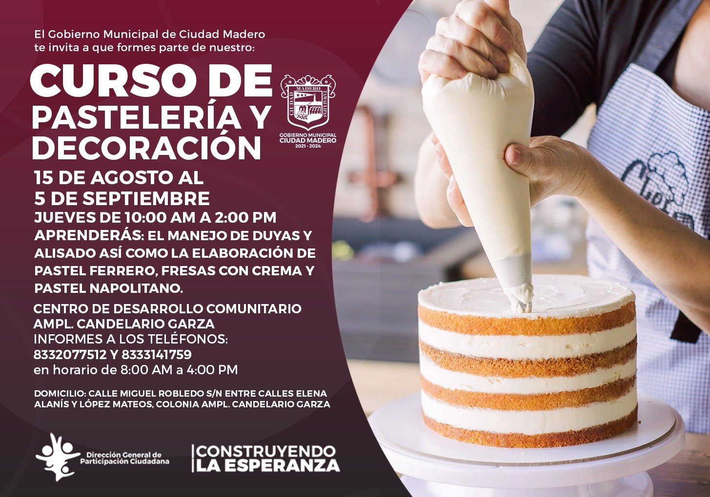 Una variada oferta de capacitación ofrece el Gobierno de Ciudad Madero a la población, por lo que invita a participar en el Curso de Pastelería y Decoración que iniciará el próximo jueves 15 de agosto, informó la directora de Participación Ciudadana, Araceli Saldierna Trujillo.Resaltó que en la administración municipal del alcalde Adrián Oseguera Kernion, se han implementado diversos talleres de este tipo, como por ejemplo: repostería y galletería navideña, cocina internacional y mexicana, entre otros.En esta ocasión, explicó, se llevará a cabo el Curso de Pastelería y Decoración del 15 de agosto al 5 de septiembre, todos los jueves de 10:00 a 14:00 horas en el CDC Ampliación Candelario Garza.Cabe hacer mención que las clases estarán a cargo de Cristina Aguillón Mortero, quien enseñará las técnicas para el manejo de duyas y alisado, así como la elaboración del pastel Ferrero, fresas con crema y napolitano.La funcionaria municipal, indicó que el objetivo es proporcionar las herramientas necesarias a quienes participen y así puedan emprender un negocio, además de obtener un ingreso económico extra.Para mayor información, los interesados pueden comunicarse a los teléfonos 833-207-7512 y 833-314-1759 en horario de 8:00 a 16:00 horas, o bien acudir al CDC Ampliación Candelario Garza, ubicado en calle Miguel Robledo s/n entre calles Elena Alanís y López Mateos.