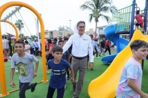 La inversión total en estas iniciativas supera los 10 millones de pesos y forma parte de una inversión pública histórica de 2025, que superará más de 215 millones de pesos. El presidente municipal acompañado de su esposa Dunia Marón Acuña presidenta del Sistema DIF; así como de su cuerpo de síndicos y regidores; primeramente, en la colonia Hidalgo Oriente fue recibido por las vecinas y vecinos, para la inauguración de la pavimentación a base de concreto hidráulico de la calle Aguascalientes; posteriormente arribó a Miramapolis, para hacer la entrega del Parque recreativo ubicado en Andador Atlántico. En este parque recreativo ahí, el mandatario explicó, que, una vez retirada la infraestructura obsoleta, se trabajó en la instalación de módulos infantiles, construcción de una nueva trota pista, colocación de pisos de concreto, iluminación periférica y central, instalación de bancas, módulos ejercitadores, mesas para ajedrez y picnic; y cámaras de videovigilancia conectadas al C-5.