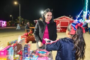 Mónica Villarreal encabezó la entrega de juguetes, regalos, dulces y refrigerios a los menores, quienes además tuvieron la oportunidad de disfrutar libremente de los juegos mecánicos y demás atracciones de la feria y de las villas navideñas.