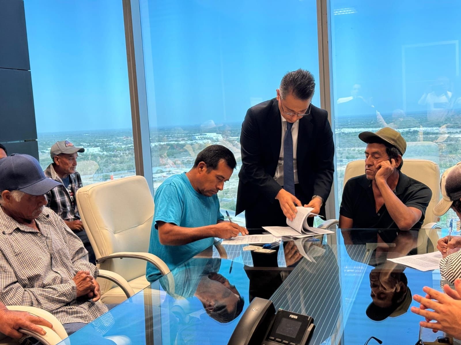Ciudad Victoria, Tamaulipas. – El gobierno de Américo Villarreal Anaya pagó la indemnización que se les había prometido durante cinco administraciones gubernamentales a los pobladores de los ejidos San Juan de Oriente y San Antonio, por los predios que ocupa la carretera Juan Capitán- El Chihue, quienes tuvieron que esperar treinta años para recibir este pago. Este jueves, en las oficinas de la Secretaría de Obras Públicas, el titular de la dependencia, Pedro Cepeda Anaya firmó con autoridades ejidales y los representantes de la Concesionaria Rumbo Nuevo S.A. de C.V., el convenio de ocupación previa de la carretera Juan Capitán-El Chihue, así como el recibo de pagos y la entrega de los planos correspondientes. Este acuerdo permite legalizar la tenencia de la tierra a nombre de Gobierno de Tamaulipas y cumplir a los ejidatarios con el pago de indemnización por su tierra, una deuda histórica que luego de cinco gobernadores ha sido cubierta por Américo Villarreal Anaya. Pedro Cepeda Anaya reiteró, ante los líderes ejidales, José Luis Montelongo Rodríguez y Jesús Zapata Urbina y a los directivos de la empresa concesionaria, Artemio Cardozo Torres y Trinidad Albarrán Robles, el compromiso por contar con una carretera segura y moderna. Agregó que también es un compromiso del Gobierno del Estado garantizar que los recursos que se generen sean destinados al desarrollo y bienestar de las comunidades rurales de esta región.