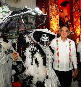 Sistema DIF Estatal, María de Villarreal presidieron la premiación del concurso estatal de catrinas y catrines «Almas Tamaulipecas» y la muestra del altar monumental del Día de Muertos en las escalinatas de Palacio de Gobierno . Acompañado por familias que se dieron cita en la Plaza Juárez, la tarde de este domingo, el gobernador aseguró que esta celebración contribuye para volver a construir este gran tejido social, «quitarnos los miedos y volver a estar en convivencia y participación entre todos», dijo.