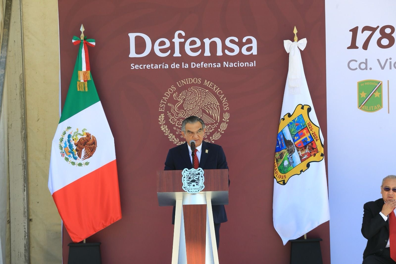 Al presidir la ceremonia cívico-militar en el paseo Pedro J. Méndez, de esta capital, acompañado por el general DEM Enrique García Jaramillo, comandante de la 48 Zona Militar, y los titulares de los poderes Legislativo y Judicial, el gobernador hizo un reconocimiento a la contribución de las Fuerzas Armadas para la construcción de la paz en Tamaulipas.