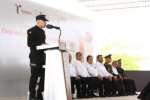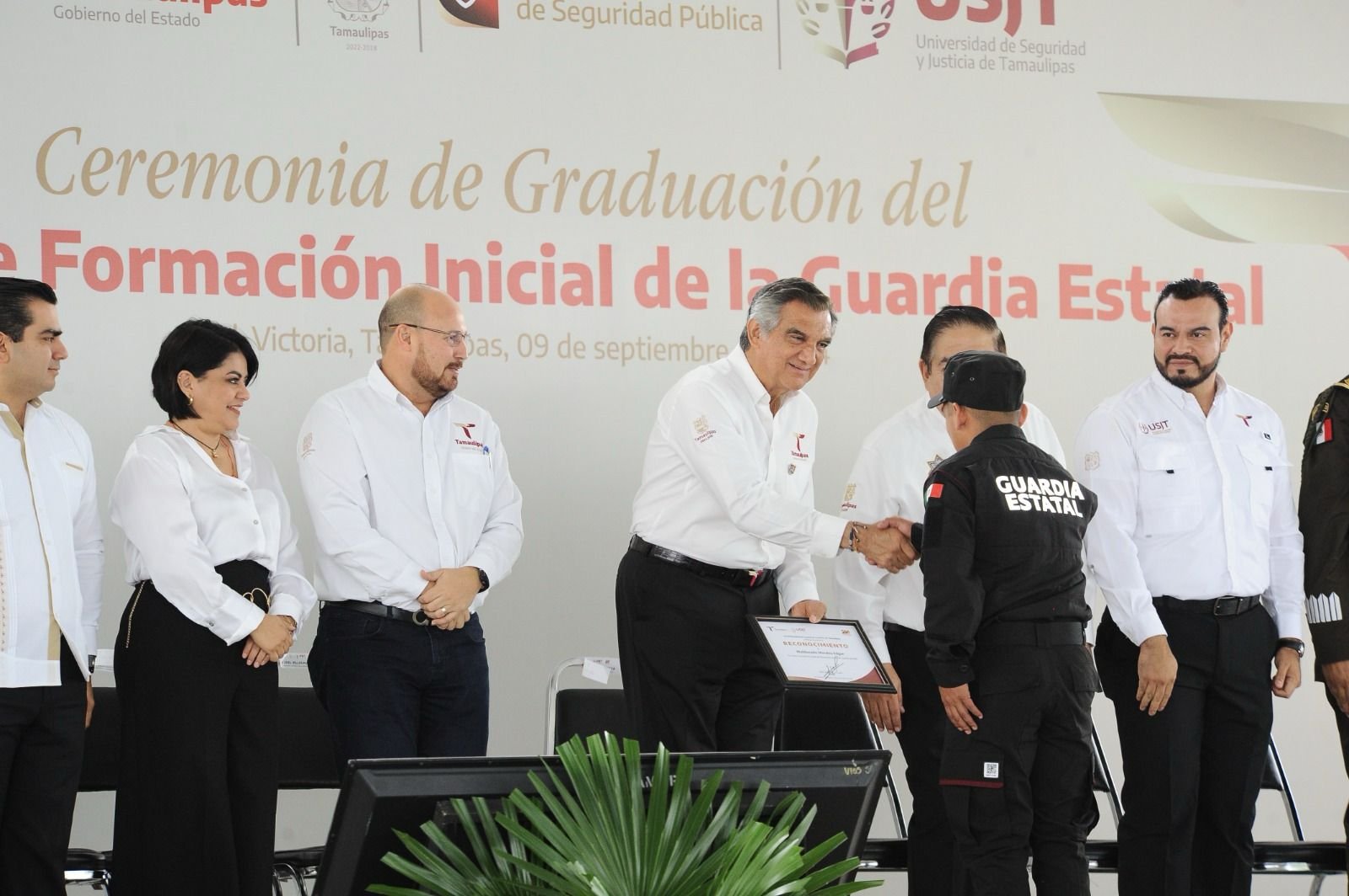 Septiembre 09 de 2024.- Ciudad Victoria, Tamaulipas.- El gobernador Américo Villarreal Anaya presidió la ceremonia de graduación de 112 cadetes que concluyeron el Curso de Formación Inicial para Policía de Proximidad de la Guardia Estatal y los exhortó a conducirse con apego a los principios de verdad, justicia y honestidad. «Que aparte de toda su formación, la guía que tengamos es la base de nuestros valores en la verdad, en la justicia y en la honestidad. Si nos conducimos en base a estos tres principios que son tremendamente sólidos y fuertes no habrá ningún reto que no podamos vencer». Acompañado por el secretario de Seguridad Pública, Sergio Chávez García y del rector de la Universidad de Seguridad y Justicia, Willy Zúñiga Castillo, el gobernador del estado inauguró también la cubierta de la explanada central de este plantel, obra que requirió de una inversión de 9.4 millones de pesos.En su mensaje a las y los graduados, Villarreal Anaya aseguró que su incorporación a la Guardia Estatal contribuirá a fortalecer los sistemas de seguridad y justicia en Tamaulipas.»Enhorabuena, que sean ustedes excelentes profesionistas del ámbito de competencia en la que se han formado, y tengan presente que los ojos de los tamaulipecos y tamaulipecas están esperanzados, que sus hijos e hijas en formación, en este ámbito que se requiere de la sociedad, daremos los resultados que están esperando de nosotros», expresó. En la ceremonia, el secretario de Seguridad Pública, Sergio Chávez García explicó que este día concluyen su formación 112 cadetes, 86 hombres y 26 mujeres, con lo cual suman 416 elementos que han terminado su preparación profesional adquiriendo habilidades de desarrollo humano, ética, actuación policial, prevención, proximidad, así como técnicas y tácticas policiales durante 20 semanas de trabajo y 1,080 horas de enseñanza. “En lo que va de esta administración, crecimos nuestra matrícula de licenciatura de 505 alumnos en 2022 a 853 en este ciclo escolar, graduándose en el mismo periodo de tiempo, 95 nuevos licenciados en Criminología 78 nuevos licenciados en Ciencias Policiales y 59 nuevos licenciados en Ciencias Policiales”, mencionó. “Muchas gracias, señor gobernador, su ejemplo de trabajo es guía para todos nosotros”, afirmó.A nombre de los nuevos integrantes de la Guardia Estatal, Cristian Misael Guarneros Alonso aseguró que la enseñanza y los conocimientos adquiridos en la Universidad de Seguridad y Justicia los pondrán al servicio de las y los tamaulipecos para contribuir a preservar la seguridad la paz y bienestar en nuestro estado.El gobernador también entregó reconocimientos a los alumnos más destacados de cada grupo: Angel Jared Méndez Hernández, Said Demetrio Tamariz Hernández, Amado León de la Fuente Morín y Edgar Maldonado Morales. Acompañaron al gobernador en esta ceremonia: Úrsula Salazar Mojica, presidenta de la Junta de Coordinación Política del Congreso del estado; David Cerda Zúñiga, presidente del Supremo Tribunal de Justicia; Héctor Joel Villegas González, secretario general de Gobierno; el general Carlos Elizondo Serrano, en representación de la 48a Zona Militar; el teniente Fernando Meneses Martínez, representante de la Guardia Nacional y el subsecretario de Seguridad Pública, Alex Melgarejo Torres.