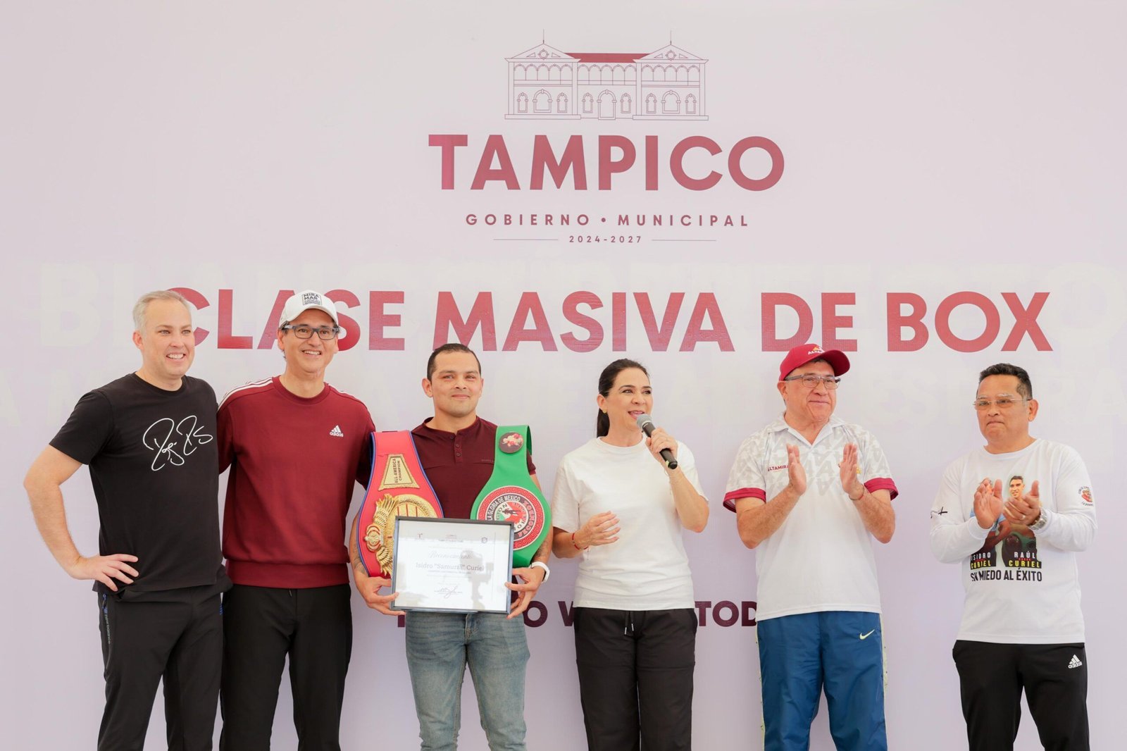 La alcaldesa destacó el esfuerzo de la presidenta Claudia Sheinbaum por fortalecer la reconstrucción del tejido social, mediante la promoción del deporte y la convivencia familiar en todas las comunidades y ciudades del país.“Nuestra presidenta de México, la doctora Claudia Sheinbaum Pardo, quiere impulsar la práctica de algún deporte, y el boxeo va a ser el deporte nacional de todos los mexicanos, al alcance de cualquier persona. Por nuestra parte, los invitamos a seguir viniendo cada domingo en familia para que nos acompañen en esta gran actividad”, puntualizó.El evento incluyó un `opening’ artístico a cargo de las escuelas municipales: “Breaking, Jazz y Hip Hop de Tampico”, y “Black and White”, así como un reconocimiento por su destacada trayectoria en el boxeo al deportista tampiqueño Isidro “Samurai” Curiel, Campeón Continental de la UBO. Al inicio de esta actividad también asistieron la senadora Olga Patricia Sosa Ruiz; la diputada local Lucero Deosdady Martínez; la presidenta del Sistema DIF Tampico, Luz Adriana Villarreal Anaya; el titular de Deportes en el municipio, Fernando Tamayo Medina, así como cientos de familias y aficionados.