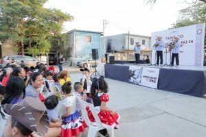 Cumpliendo el compromiso de fortalecer el tejido social y generar entornos seguros para la convivencia familiar y colectiva, la Presidenta municipal Mónica Villarreal Anaya encabezó la jornada «Cultura de La Paz en tu Colonia», un programa desarrollado a través de la Secretaría de Cultura, en colaboración con la Secretaría de Seguridad y Protección Ciudadana. En esta ocasión la interesante jornada cultural se llevó a cabo en la colonia  Morelos, donde cientos de familias disfrutaron de un amplio programa artístico en el que participaron la escuela primaria «Francisco Veyro»; el Trío Alegría Huasteca; Steven Hernández “Tocando Ando”; y “Los Tríoachis”. Mónica Villarreal, acompañada de la subdirectora de Cultura, Blanca Pulido, subrayó que este programa busca fomentar valores, fortalecer la identidad comunitaria y brindar espacios para la sana recreación de las familias. “Estas actividades reflejan el compromiso que tenemos de seguir impulsando iniciativas que contribuyan a la construcción de una sociedad más unida, pacífica y con acceso a la cultura para todos”, expresó. Detalló que las jornadas culturales forman parte de las acciones coordinadas que se realizan con la Mesa de Seguridad y Construcción de Paz, encaminadas al fortalecimiento del tejido social a través del arte y cultura, pilares elementales en el fomento de la integración familiar y comunitaria.Por último Villarreal Anaya indicó que «Cultura de la Paz en tu Colonia» seguirá fortaleciéndose para mostrar la extraordinaria riqueza cultural y el enorme talento que existe entre los artistas tampiqueños y los exponentes culturales de la región huasteca.
