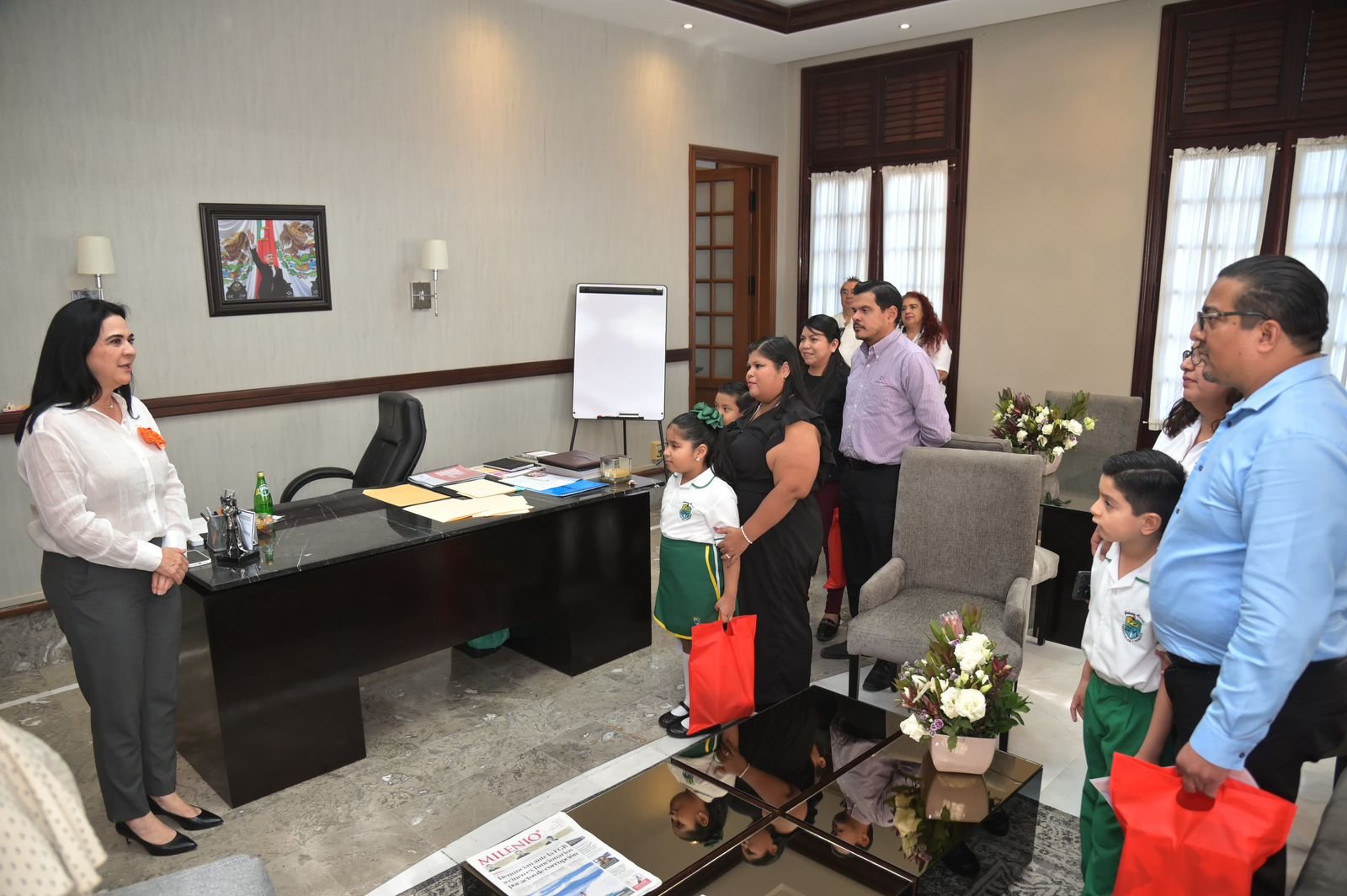 El acto tuvo lugar en la Palacio Municipal, donde Villarreal Anaya recibió la visita de los talentosos alumnos de la Escuela de Preescolar y Primaria «Gabriela Mistral», quienes fueron seleccionados por su destacada participación en la categoría de 5 a 8 años de edad, el cual tuvo como objetivo en fomentar el uso adecuado del número de emergencias 911.