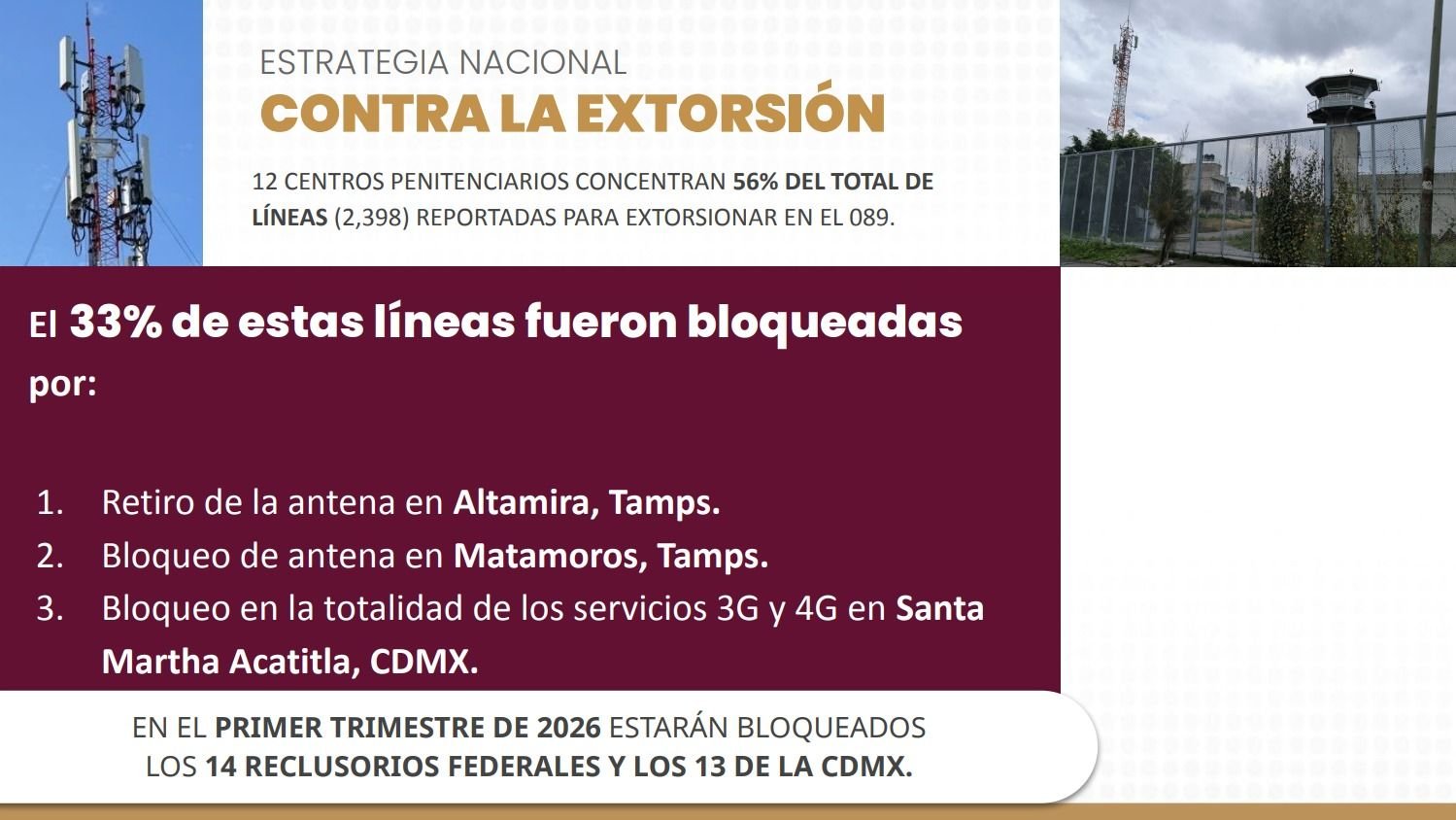 Se prevé que para el primer trimestre de 2026 estarán bloqueados los 14 reclusorios federales y los 13 de la Ciudad de México. Las cifras proporcionadas en el informe de esta mañana, en lo que corresponde a Tamaulipas, son resultado del trabajo conjunto entre el gobierno de Américo Villarreal Anaya, y su compromiso con la construcción de un estado más seguro y en paz, con el respaldo del gobierno federal, así como del esfuerzo coordinado de las instituciones de seguridad pública para seguir garantizando la paz y la tranquilidad de las familias tamaulipecas.